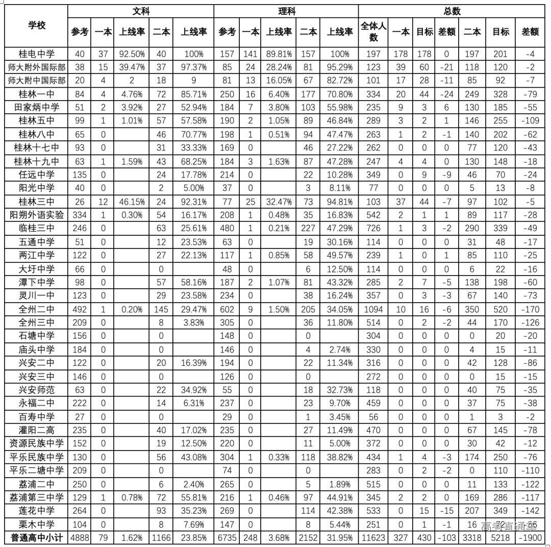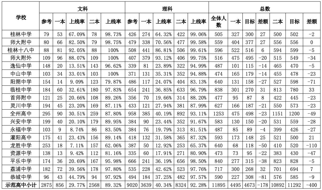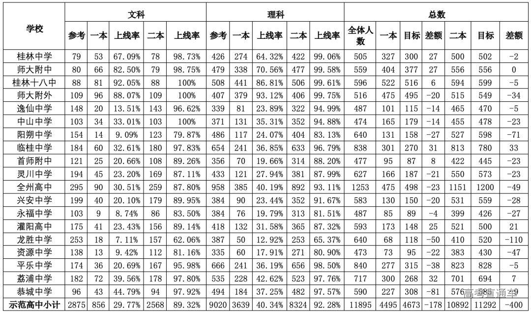 试题答案戳→:2020桂林高三一调各科试题及参考答案汇总(更新中) 据统计 全市有参考考生的学校近60所 其中示范性高中19所, 普通高中36所, 补习学校3所,中职有少量考生 共计考生26337人, 其中文科考生8625人, 理科考生17712人。