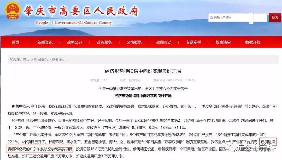 2019年6月19日,广东华航航空以总价6750万元竞得高要两块教育、科研用地,总面积逾20万平,规划建设广东华航航空学院。