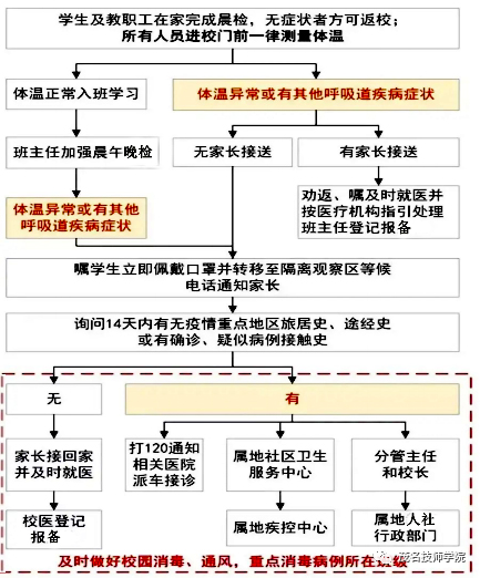 1.学校实行全封闭管理,学生返校后未经允许不得离校,不得叫外卖;无特殊情况,家长不准探望学生。返校后连续上两周课放一次大周末假,因此,学生返校时要备足伙食费及生活用品。2.返校后,班主任在班会上组织学习《茂名技师学院传染病防控第一课》。3.实行晨检、午检及晚检制度,凡身体出现发热、干咳、腹泻等症状异常情况的学生都需按程序报备,必要时由家长接回及时就医。