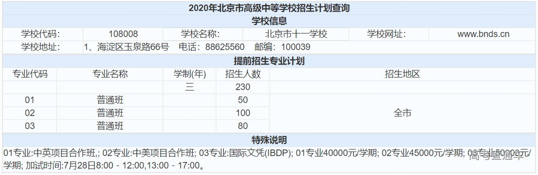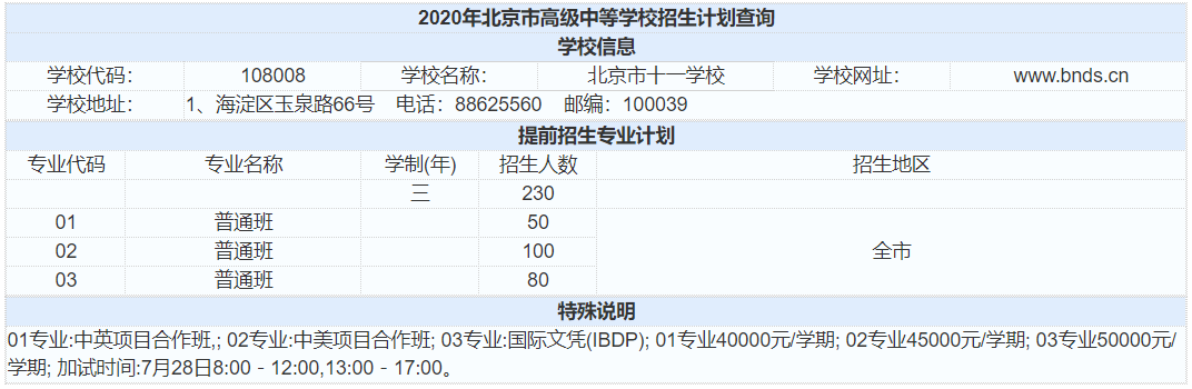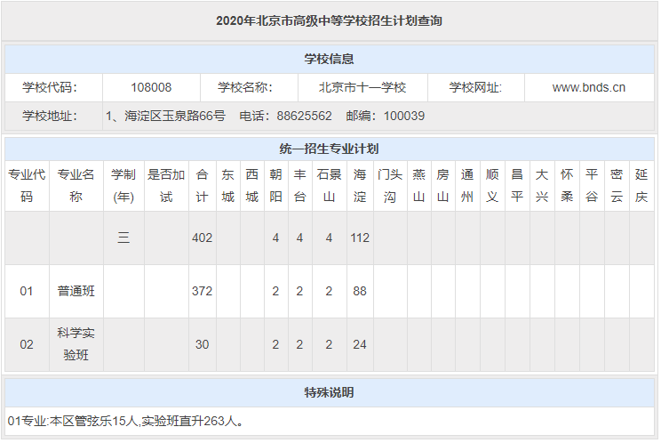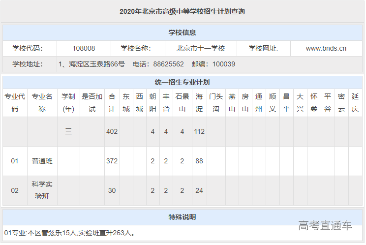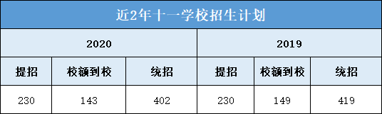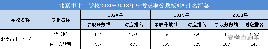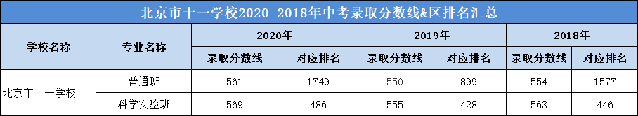 1 十一学校近3年高考成绩 十一学校高考成绩成绩很亮眼、教学水平超高。以下为近3年十一学校高考成绩,一起来看看↓ 2020年高考成绩 最高分711分,位居北京市前十名; 清北裸分上线人数31人(687+); 670分以上学生80人,占北京市670+人数(1112人)的7.2%; 660分以上学生137人,占北京市660+人数(1776人)的7.7%; 650分以上人数183人,占北京市650+人数(2596人)的7.1%; 通过强基计划录取到清华北大学生人数为32人(北大15人,清华17人),占清华北大通过强基计划在北京市录取总人数(167)的1/5; 最终被清北实际录取学生人数为69人(含北医、艺术特长等); 本届达到特殊类型自招控制线学生比例97.6%; 本届出国班有多名学生进入全球综合排名前50的学校如剑桥、帝国理工、加州大学圣地亚哥分校等,另有两名同学进入音乐顶尖院校伯克利音乐学院。 2019年高考成绩 文科680分以上5人(北京市14人,这也是海淀前10名中的5人),至高分694分。文科650分以上25人(以上均为裸分)。 理科700分以上2人,至高分704人,文理市前十学校占比四分之一。理科670以上61人,650分以上169人(以上均为裸分)。 文理650分以上占全市7.9%,占海淀区16.7%。 2018年高考成绩 2018年十一学校高考成绩总体保持稳步上升,高分段人数优势明显。 650分以上人数为165人,比去年增加了59人; 680分以上人数为39人,占北京市680分及以上总人数的7.14%。学校文理科成绩继续保持稳定均衡。据说,有83人次(去重复后,实有61人)获得清华、北大的自主招生和领军、博雅计划的降分录取政策,创历史新高。 根据上表可以看出: 十一学校包含普通班和科学实验班,两个班型的录取分数线和区排名均不同,科学实验班高于普通班。但从整体看,近3年,十一学校的录取分数线相对平稳,区排名在2019年或因受到了校额到校政策的影响,排名上升幅度很大,但在2020年排名下降比较厉害,根据对比各项数据,可能是由于相对2019年,2020年的校额到校名额减少,面向海淀区的统招人数增加。 虽2020年十一学校区排名下降,但小编认为报考难度不会减,对于想要报考十一学校的2021考生来说,还是要做好充分的备战准备,如果你所在学校有校额到校名额,一定要注意提升校内排名;如果你所在学校没有校额到校名额,那么大家除了关注成绩外,还要关注自己在全区的排名。 2 十一学校近2年招生计划(参考版) 从上表(参考版)看: (1)从招生总数上看,2020年十一学校共计划招生775人;2019年十一学校共计划招生798人。2020年的招生人数相对减少;具体体现在校额到校和统招两方面; (2)提前招生方面,近2年的招生计划数相同; (3)校额到校名额,2020年相比2019年减少6个; (4)上表所列统招人数包含了面向海淀、朝阳、丰台、石景山四区以及特殊招生的人数。 根据以往数据,可以查到,2020年十一学校面向海淀区招生112人,2019年为80人,相对增加32人,这可能是排名下降的一个原因;但面向朝阳、丰台、石景山三区的招生人数没有变化,分别招生4人;另外,2020年十一学校特殊招生人数为278,2019年为327人,相对减少49人; 3 十一学校入学途径 以下是小编了解到的 2020年十一学校的几种入学途径,分享给2021年考生,仅供参考。 1、提前招生 以下是十一学校2020年的提前招生计划(来自北京教育考试院): 从上表可以看出: (1)2020年十一学校提前招生计划共计230人。且是面向全市招生,所以其他区考生也可以通过国际班跨区升入十一学校; (2)十一学校有3个国际班,分别是: 中英项目合作班,招生人数50,一学期费用在40000元; 中美项目合作班,招生人数100,一学期费用在45000元; 国际文凭(IBDP)班,招生人数80,一学期费用在50000元; (3)国际班一般都需要加试,2020年加试时间为7月28日,2021年报考国际班的考生需要注意当年的加试时间,避免错过。 提醒:由于国际班每年的费用较高,所以,想报考十一学校国际班的考生需要结合家庭经济情况和考虑是否有出国的打算。 2、校额到校计划 校额到校计划里包含市级统筹和校额到校,十一学校没有市级统筹招生名额。 2020年十一学校校额到校 共计划招生143人,校额到校基本属于校内竞争,考生只要校排名在校额到校招生计划内,同时,满足校额到校报考资格,就有很大的几率通过校额到校途径升入十一学校。 3、统招计划 2020年十一学校统招计划表 从上表可以看出: 通过上表我们可以看出,统招批次里,十一学校共有402人招生计划;其中科学实验班招生30人(与2019年相同),普通班招生372人(包含本区管弦乐15人和实验班直升263人) 3 其他基本情况(供参考) 1、关于班型 十一学校有科学实验班,中考填志愿时,学校填报十一学校,专业填报科学实验班即可,十一学校是选课走班制,没有固定班级; 2、住宿 十一学校没有公布住宿分数线,可以在入学后申请住宿,根据学生分享,往年十一学校住宿情况如下: (1)有专门的屋子可以供学生吹头 (2)宿舍有专门的学习自习室 (3)据说,宿舍是4人寝室 (4)有专门的卫生间和洗浴室 3、晚自习 晚自习需要申请,以辅导老师为选择依据,班级一般是固定的。分为两个时间段:一个是21:30下课;一个是22:30下课,学生可以进行选择。十一学校近3年录取分数线&区排名