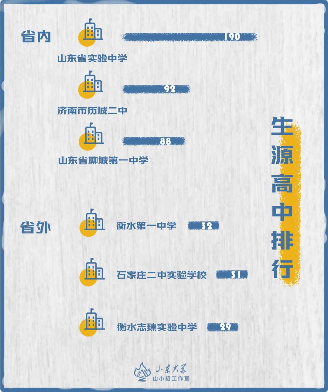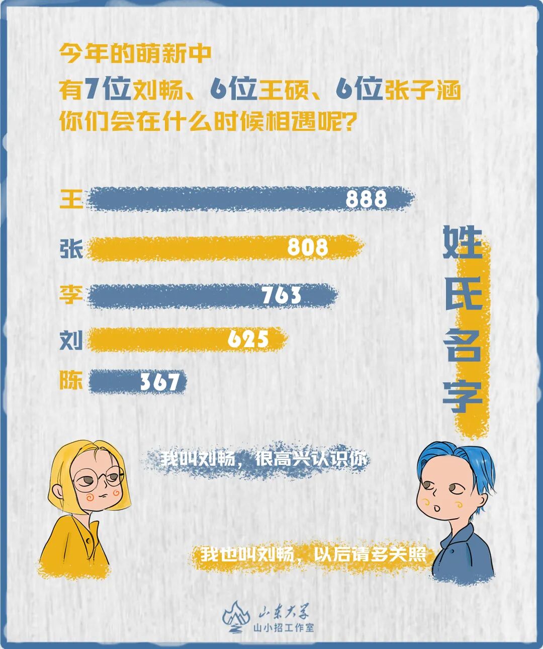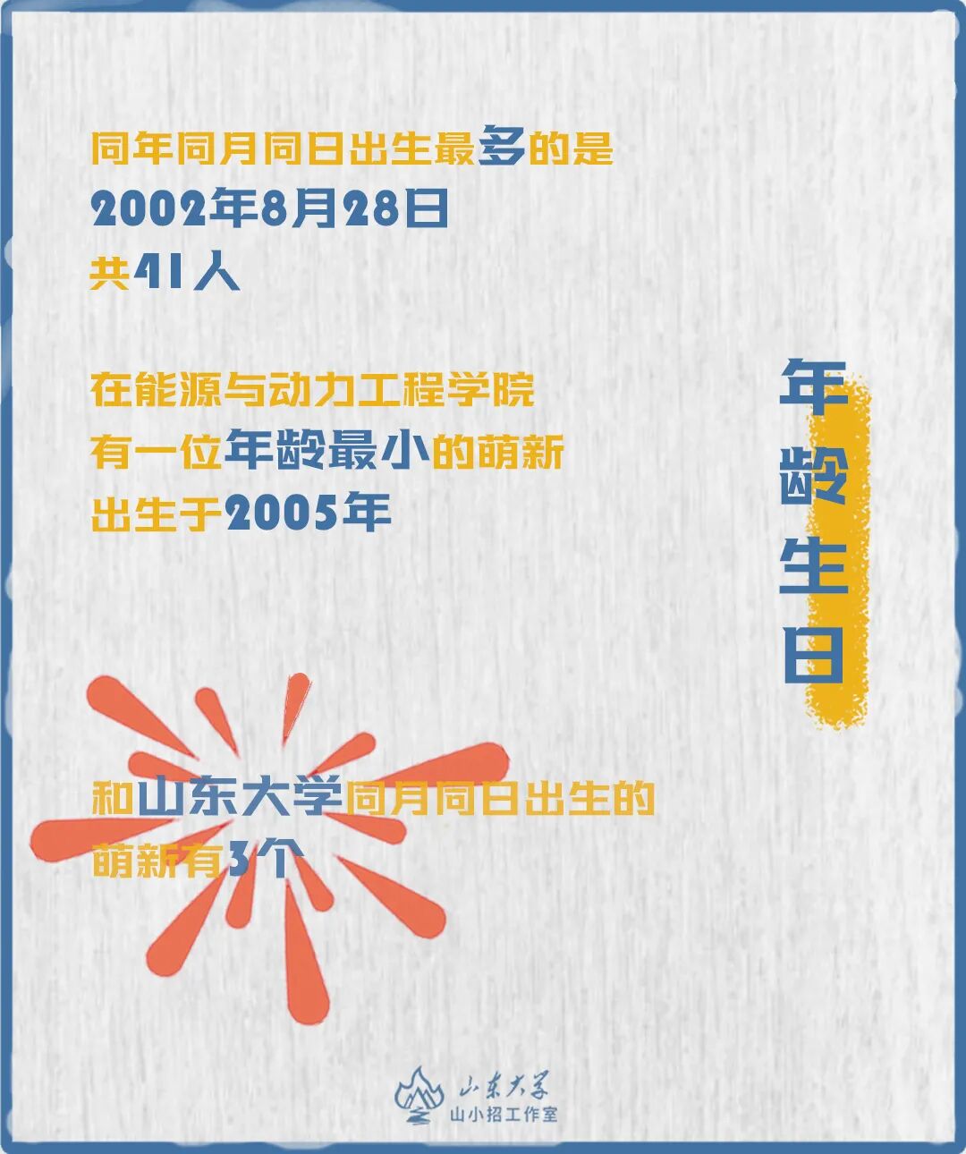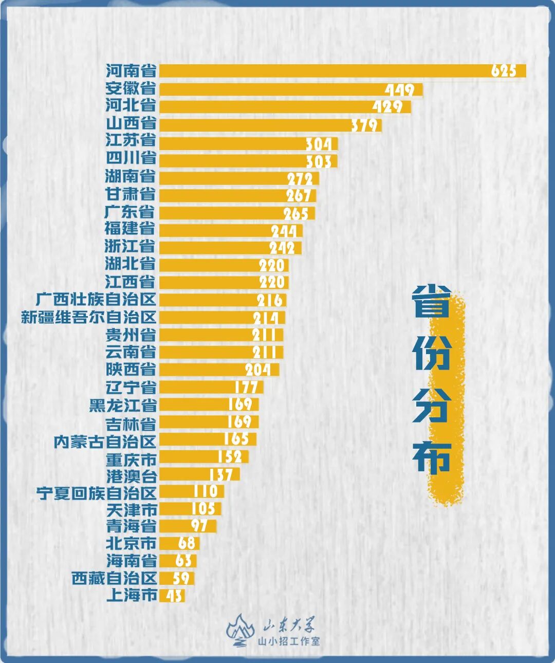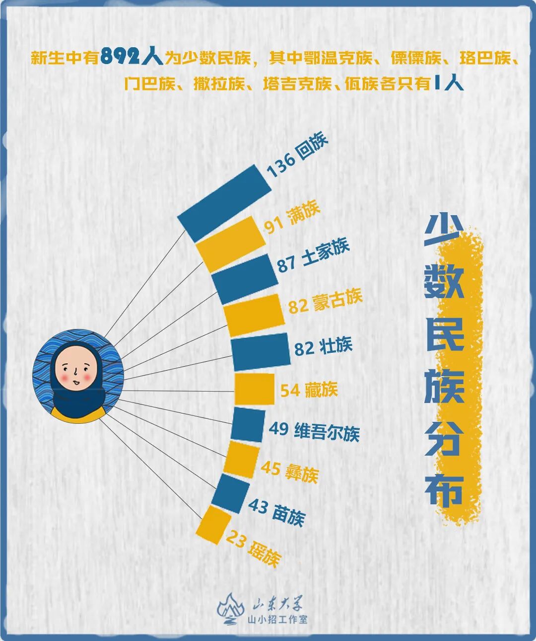 2020年9月13日 时间的齿轮飞快旋转——昨天,山大迎来与10441位(包含2020级民族预科生)“新山大人”的第一次相遇。年轻的面庞是他们统一的标识,“新同学”是对他们统一的称呼,而录取名单上的每一个名字之后,又有着不一样的故事...... 今年的招生工作有哪些亮点? 来自哪一地区的新生人数最多? 哪所高中的校友最多? 哪个年龄占比最大? 想知道这些问题的答案吗? 跟着姗姗一起来看看, 今年的本科招生大数据~ 山东省的小萌新共有3652人, 河南省、安徽省、河北省、山西省 与山东省一起组成录取人数省份TOP5。 从北疆到南国,从西陲到沿海, 我们选择在齐鲁大地开启大学生活, 宿舍里有谈不尽的家乡趣事, 言语间也存留着思乡温情。 “原来你也是这所高中毕业的呀!” 山东省实验中学、济南市历城二中 以及山东省聊城第一中学 位列省内高中录取人数榜前三名。 着眼山东省外, 衡水第一中学 是本届录取人数最多的高中。 我们有幸一起度过高中时代, 即将开启的大学生活,一定会更加精彩! 王、张、李占据了今年新生姓氏前三名。 同样姓名的同学最多有7位, 还有6位王硕和6位张子涵, 这是多么奇妙又美好的遇见! 来自36个少数民族的892名萌新, 即将在山大相遇。 人数最多的少数民族是回族, 共有136人。 “各美其美,美美与共” 我们从彼此的生活中, 看见更加多彩的中国! 从出生年份看, 2002年出生的萌新成为主力军, 年龄最小的萌新仅有15岁。 青春热血,少年才情, 因为你们的存在, 百年山大才更加朝气蓬勃! 山大诞生于10月15日, 今年有3位幸运的小萌新, 与山大同一天生日。 最好的生日礼物, 便是我们彼此相伴。 (PS:趵突泉校区的大一新生在中心校区培养) 在10441位萌新中, 男生共5814名,女生共4627名; 威海校区男女比例最为均衡。 我们将结伴而行, 在珍贵的年华里留下永不褪色的回忆。 九月裹挟着夏日的热烈盼望你们的到来, 看着白纸上密密麻麻的名字, 仿佛看到青春的气息在纸底翻涌, 勾勒出一张张明媚的笑靥, 10441位新同学, 你们的到来为山大的传统底蕴 注入了新鲜血液, 欢迎你,新山大人!