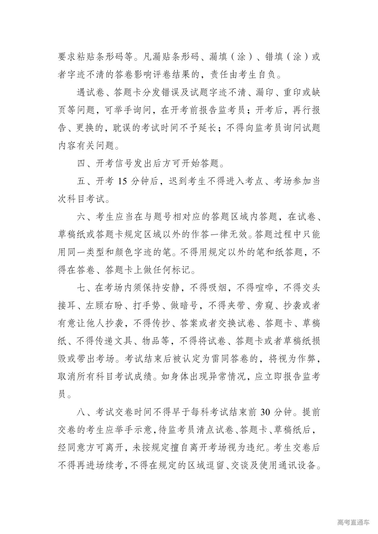 (三)注意交卷事项。考试结束前30分钟才能交卷离开考场。提前交卷考生须举手示意,待监考员允许后方可离场。离场后不得再进场续考,也不得在考场附近逗留或交谈。如遇特殊原因,须经监考员请示主考同意后方可提前离开考场。未经监考员同意擅自提前离开考场视为违纪,将取消该科考试成绩。