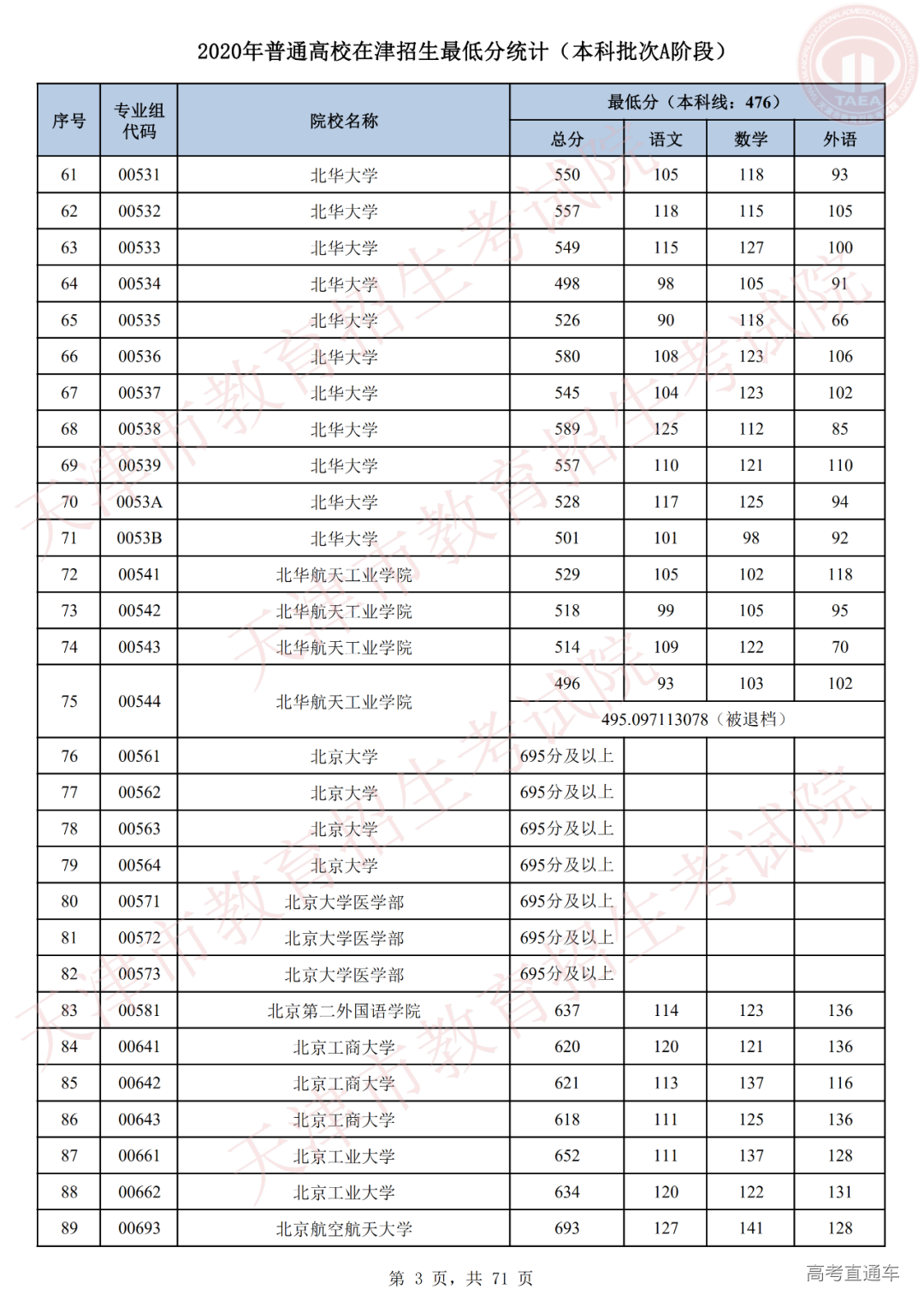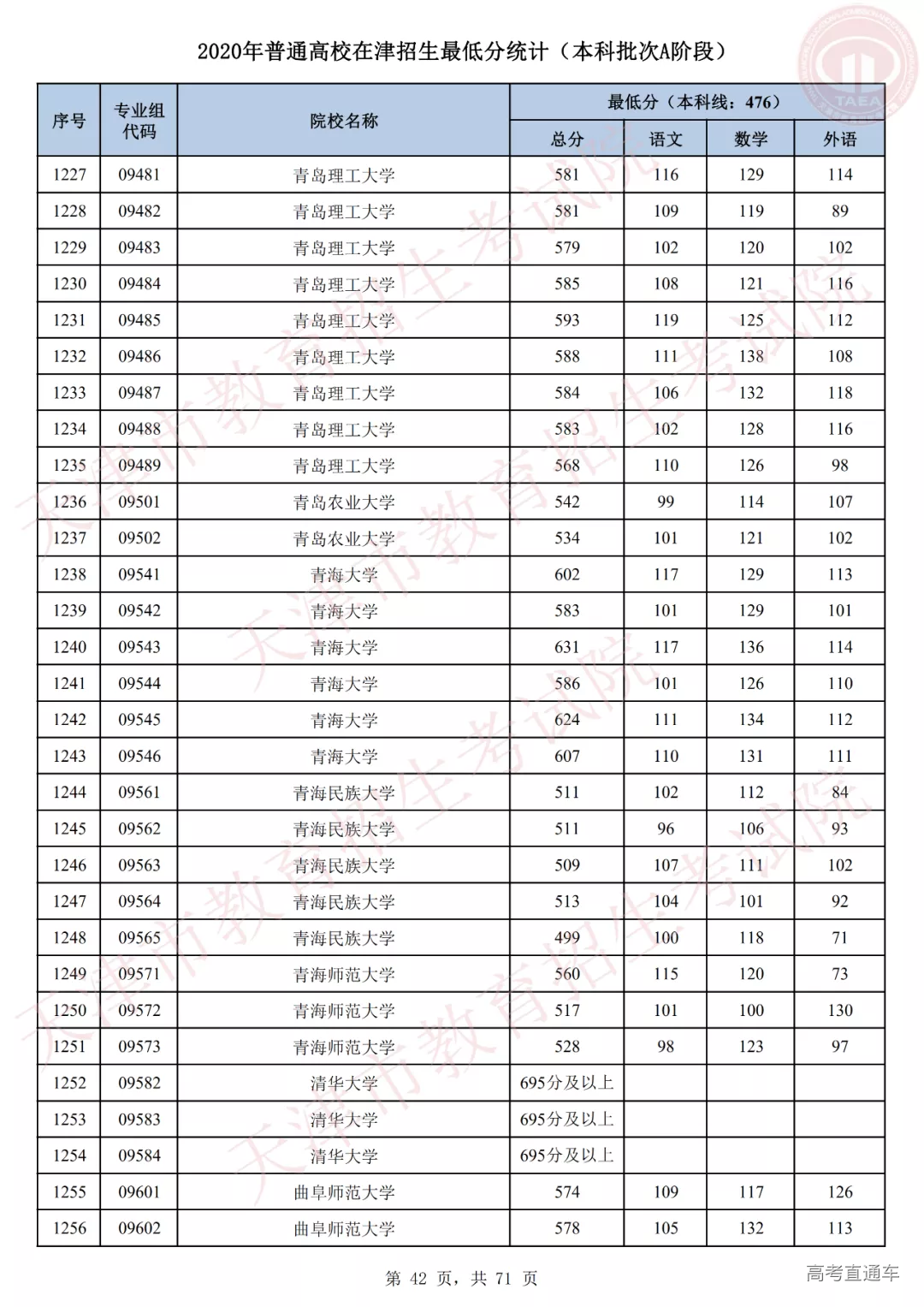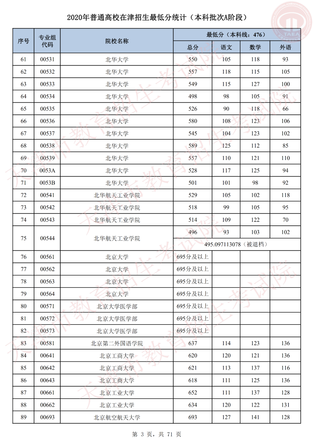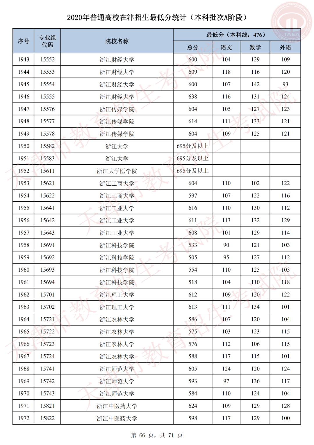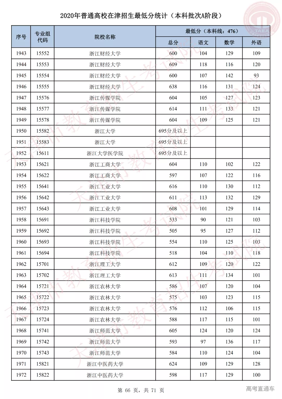 今年是我市新高考改革落地之年,为落实《教育部办公厅关于做好2020年全国普通高校招生录取工作的通知》(教学厅〔2020〕10号)有关要求,避免炒作高分段考生录取情况,积极引导考生树立兴趣选择的良好导向,营造平稳有序的录取环境,自2020年起,我市不再公布普通类本科批次高分段院校专业组具体最低分,今年确定为“695分及以上”的院校专业组不再公布。