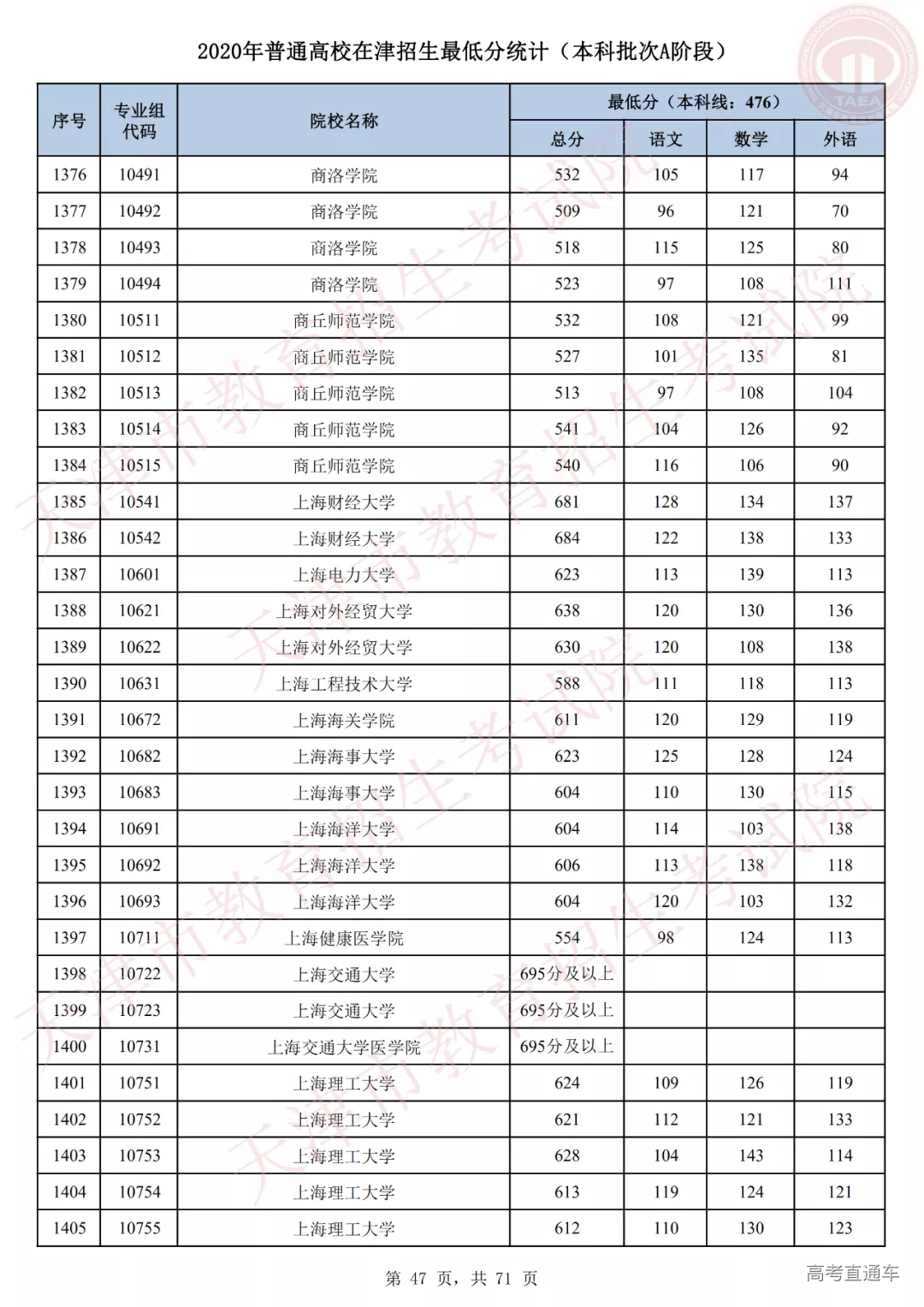 2020年录取最低分数线达到695分及以上的有北京大学(含医学部)、复旦大学(含医学院)、南京大学、清华大学、上海交通大学(含医学院)、浙江大学(含医学院)、中国科学技术大学、中国人民大学等8所院校26个院校专业组。该部分院校专业组的录取情况,考生可向报名单位及各区招办咨询。