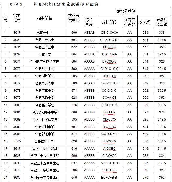 合肥市教育考试院发布了2020年普通高中录取分数线