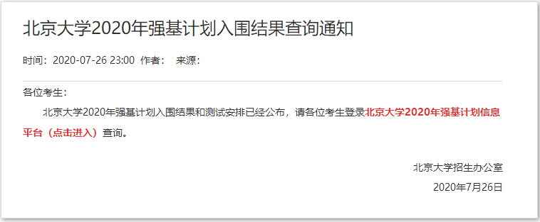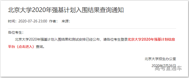 随着各省2020高考分数公布,北京大学、清华大学、中国科大等高校连夜发布强基计划入围名单及入围分数线信息!考生请及时进入报名系统查询消息。