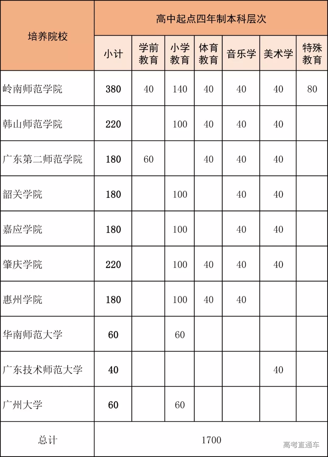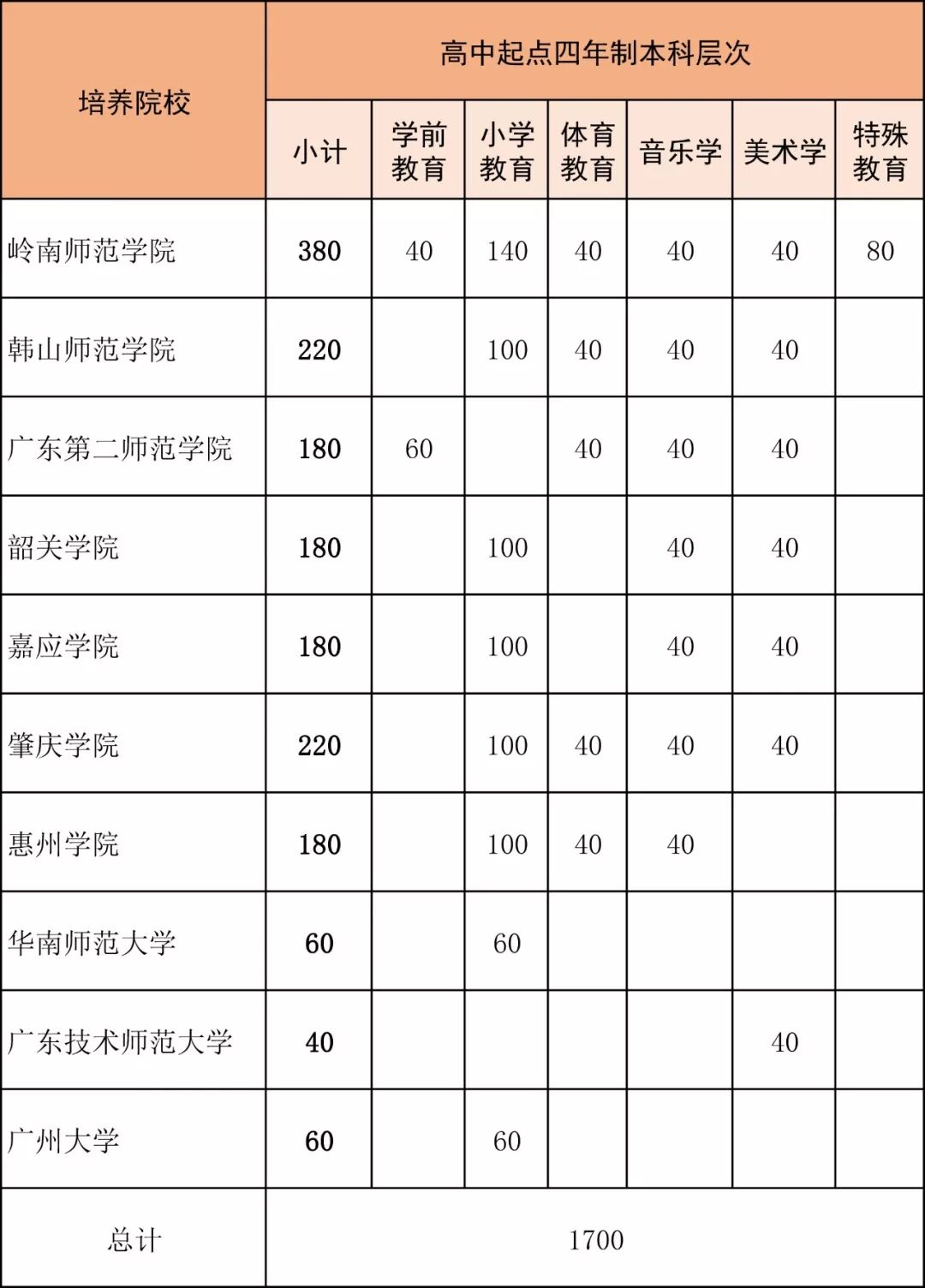 高中起点四年本科层次师范专业1700名,其中学前教育专业100名、小学教育专业760名、体育教育专业200名、美术学专业280名、音乐学专业280名和特殊教育专业80名。面向全省范围招生,学生毕业后到定向计划来源地乡镇及乡镇以下农村公办学校任教、特殊教育专业到定向计划来源地县域内相关学校任教,任教时限不少于6年。