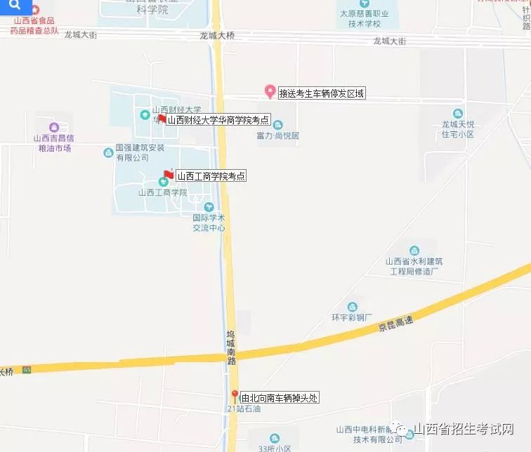 三、从坞城南路由北向南的考生车辆,到达工商学院校门口后考生下车,凭准考证进入校园,所驾车辆继续向前行驶至城西村路口(21站加油站)掉头行驶至龙城南街路段临时停车区域停车。