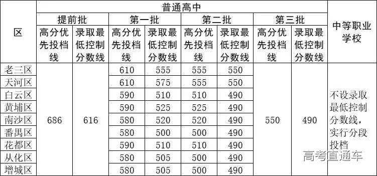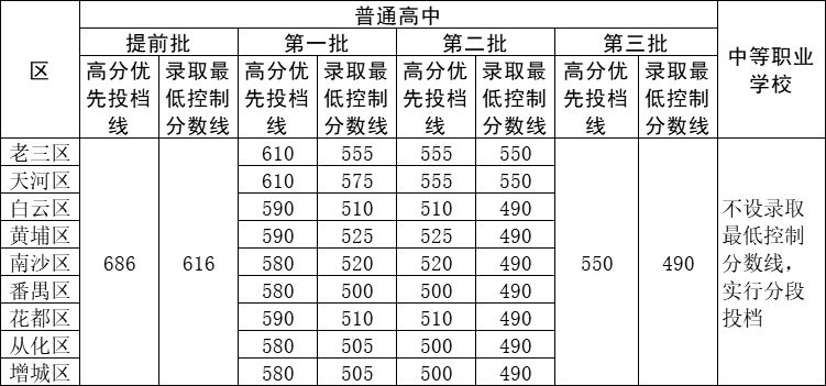 ■ (二)第一批高分优先投档线各区均有不同程度的上调,老三区、天河区为610分,白云区、黄埔区、花都区为590分,其他区为580分。录取最低控制分数线在去年基础上普遍上调。