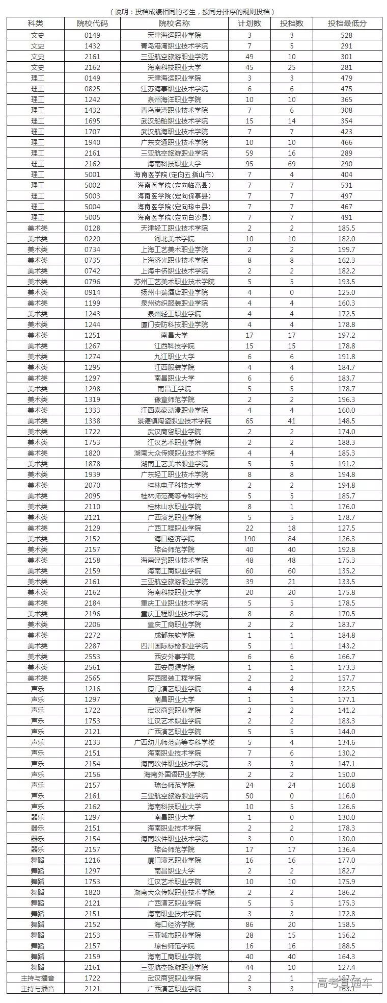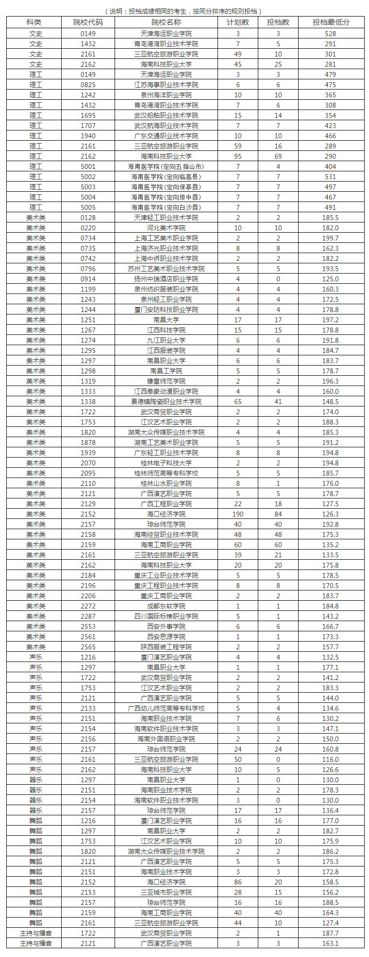 海南省普通高校招生专科提前批平行志愿投档分数线