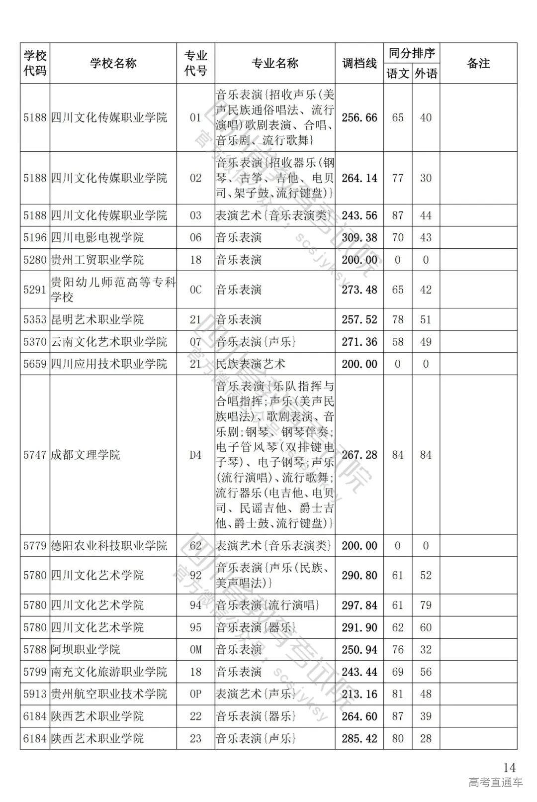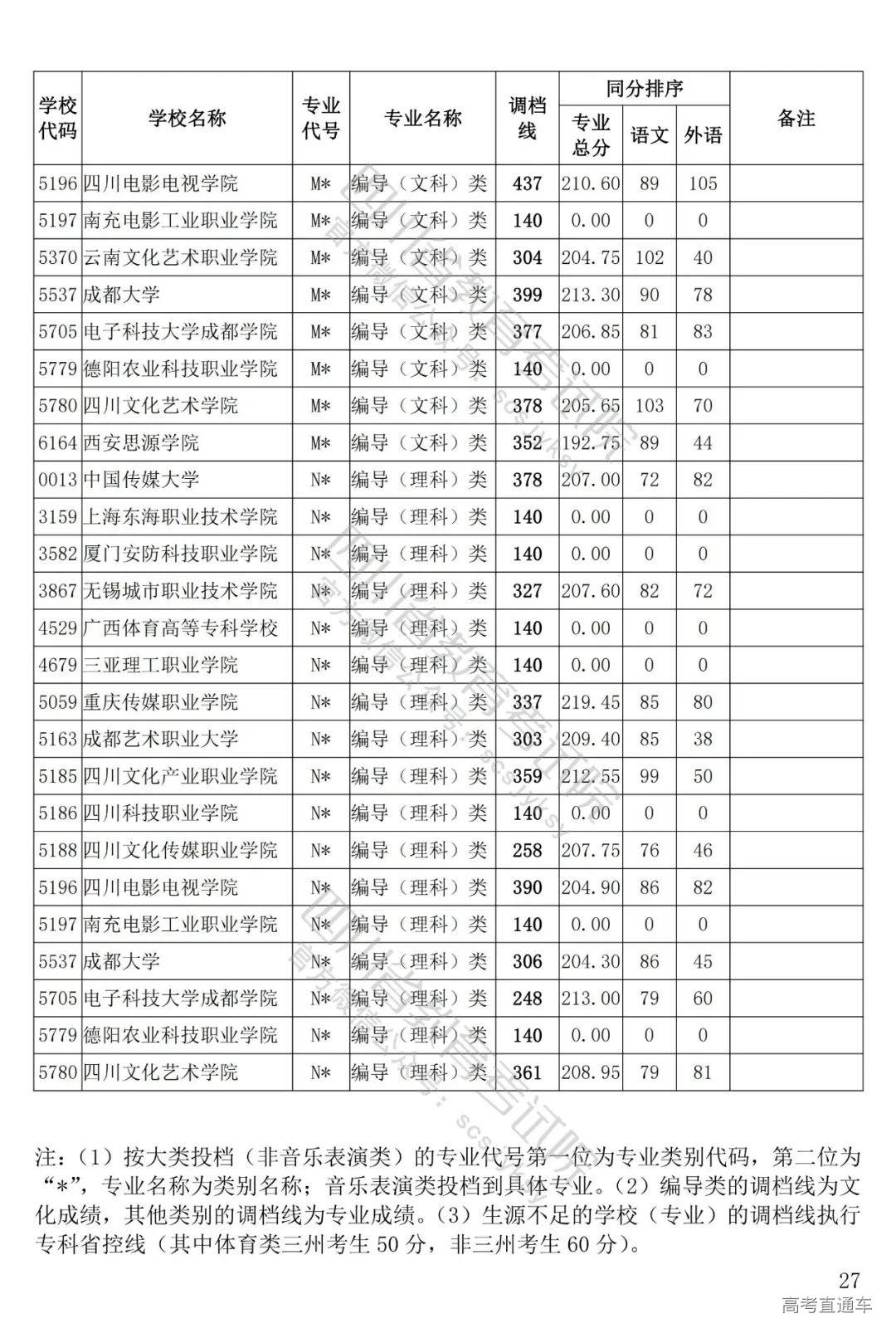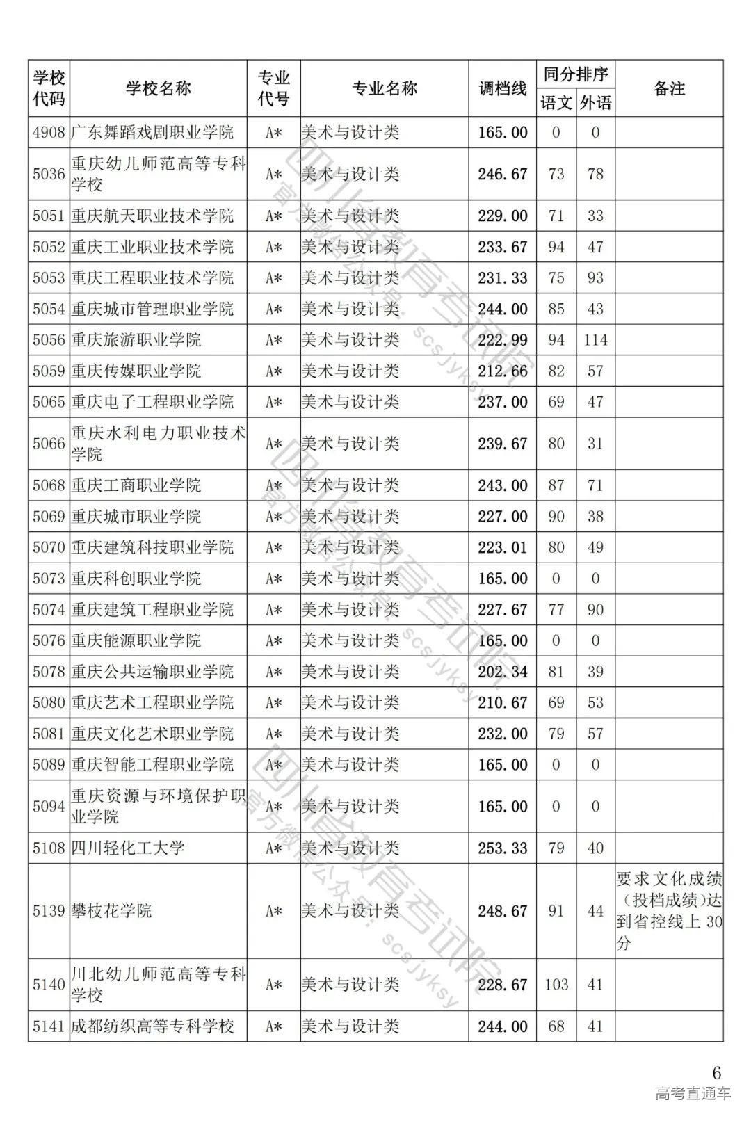 如舞蹈类专业调档线前十的院校中,省内院校占了6所,分别为四川大学锦江学院、四川传媒学院、四川艺术职业学院、四川电影电视学院、四川文化产业职业学院、四川幼儿师范高等专科学校。此外,四川艺术职业学院的书法学类专业和四川电影电视学院的编导(理科)、音乐学类专业在我省同类专业调档线排名中均位列第一。