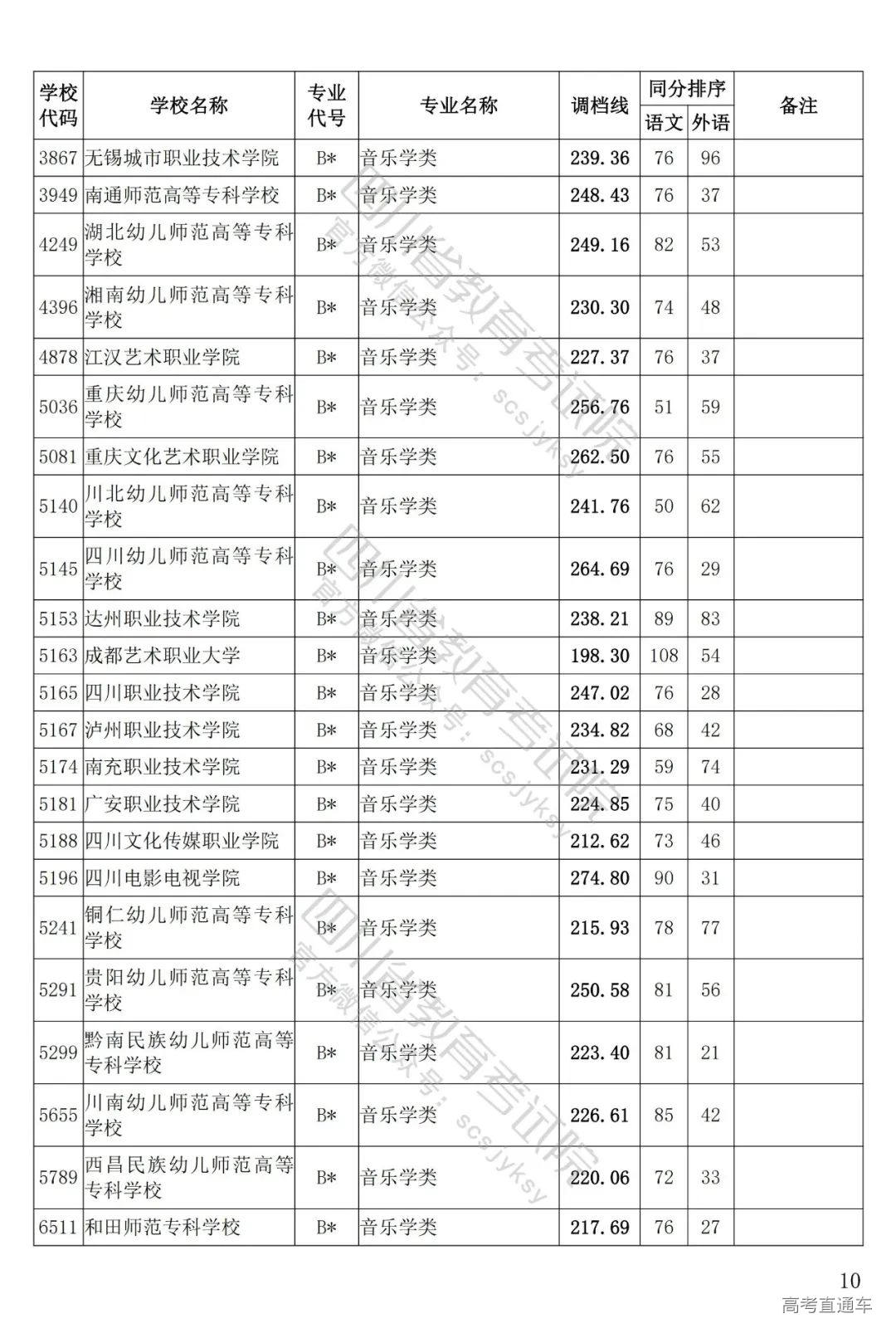 音乐学类调档线前十的院校中,7所为师范类院校,分别是四川幼儿师范高等专科学校、重庆幼儿师范高等专科学校、闽江师范高等专科学校、赣州师范高等专科学校、贵阳幼儿师范高等专科学校、湖北幼儿师范高等专科学校、南通师范高等专科学校。