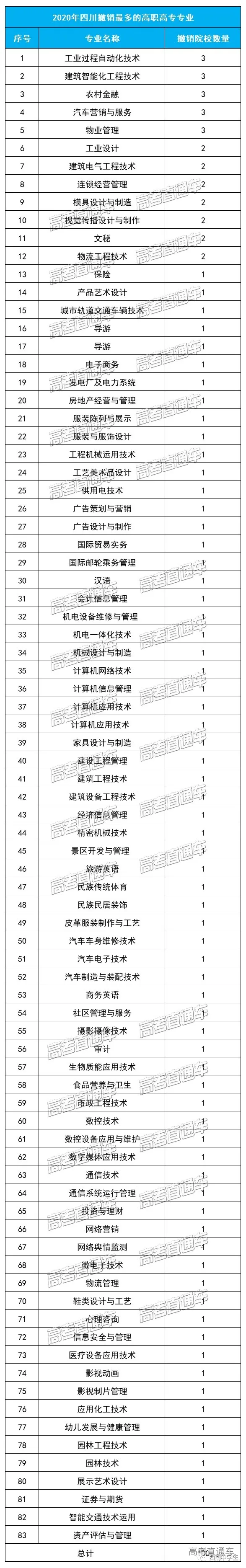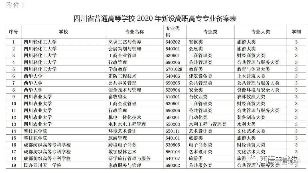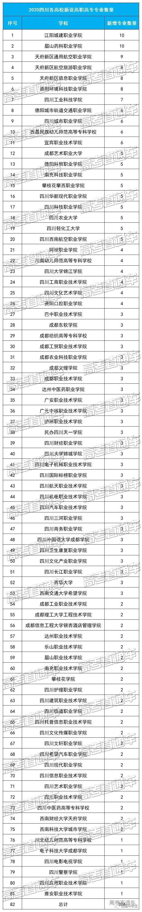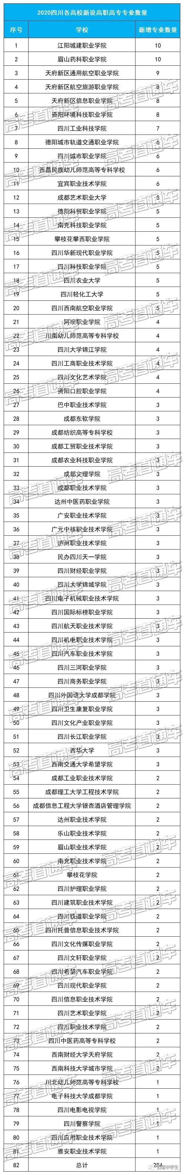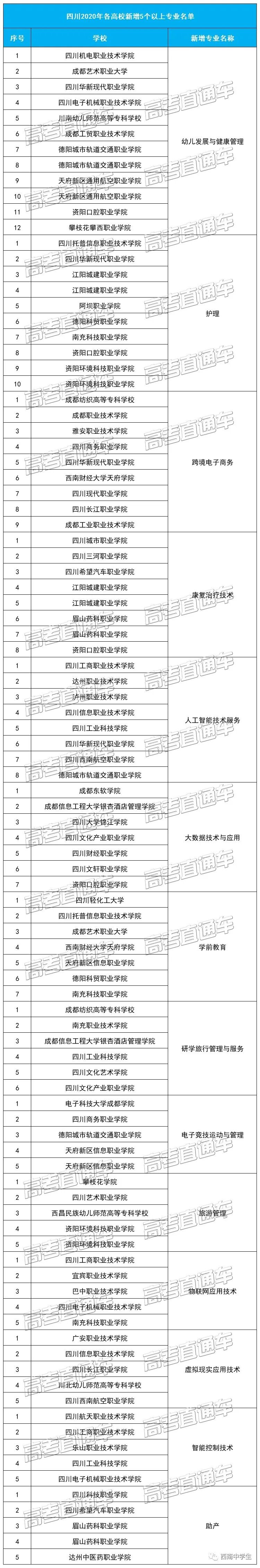 四川公布2020新设和撤销高职专业结果 有关高等学校: 根据《教育部关于公布2020年高等职业教育专业设置备案和审批结果的通知》(教职成函〔2020〕1号)精神,在我省有关高校申报2020年新设专业和拟招生专业备案的基础上,经教育部审批和省级审查,同意81所高校新增284个高职高专专业(含259个3年制,25个5年制,见附件1),同意27所高校撤销100个高职高专专业(见附件2),并对111所高校2020年拟招生高职高专专业予以公布(见附件3)。请各有关高校严格按照本通知公布的备案结果合理安排高职招生计划,已撤销和未同意备案的专业2020年不得安排招生。 希望各校进一步明确办学定位,调整优化专业结构,突出办学优势和特色,落实新设专业关于资金、师资、课程等建设内容的承诺,围绕地方经济社会发展需求,加强专业内涵建设,确保拟招生专业的教学水平和人才培养质量。 四川省教育厅 2020年3月4日 附件1:新设高职高专专业备案表 长按二维码打开 回复“新增专业” 查看完整名单 附件2:拟撤销高职高专专业备案表 长按二维码打开 回复“新增专业” 查看完整名单 2020年四川拟招生高职高专专业备案表 由于2020拟招生专业名单较多, 篇幅限制, 完整名单请在后台回复查看。 长按二维码打开 回复“新增专业” 查看完整名单 2020年,四川哪些学校新增最多专业? 西南中学生(ID:sczxswx)通过分析整理以上数据为大家统计出了2020年四川新增专业最多的学校。 可以看出,新增最多专业的学校为江阳城建职业学院和眉山药科职业学院,分别各自新增了10个专业。天府新区通用航空职业学院新增9个专业,天府新区航空旅游职业学院、天府新区信息职业学院、资阳环境科技职业学院各新增了8个专业。四川工业科技学院新增了7个专业。 那这几个学校分别都新增了什么专业呢? 长按二维码打开 回复“新增专业” 查看完整名单 2020年,四川哪些高职专业新增最多? 以下表格只统计四川2020年各高校新增5个以上高职高专专业名单。 可以看出,2020四川新增最多的高职高专专业为幼儿发展与健康管理,一共有12所高校开设,其次是护理专业,一共有10个高校开设,接下来是跨境电子商务,一共有9个学校。 2020年,四川哪些高职高专专业被撤销最多? 你读的专业被撤销了吗? 长按二维码打开 回复“新增专业” 查看完整名单