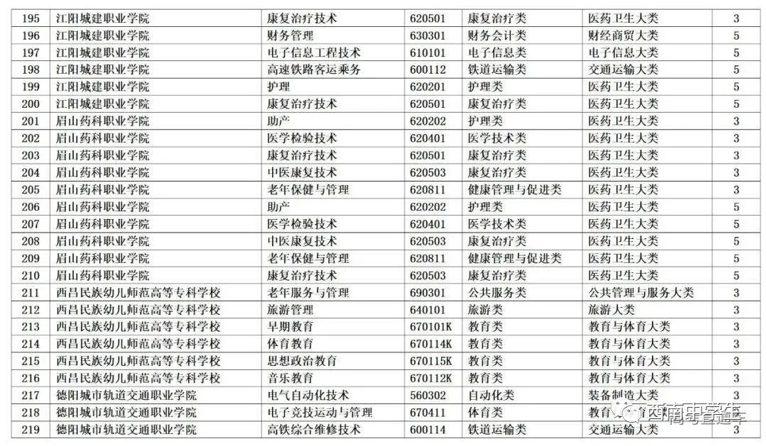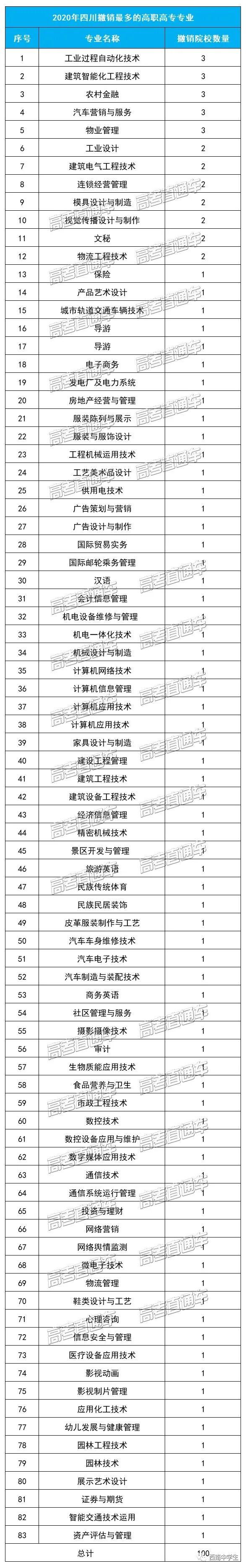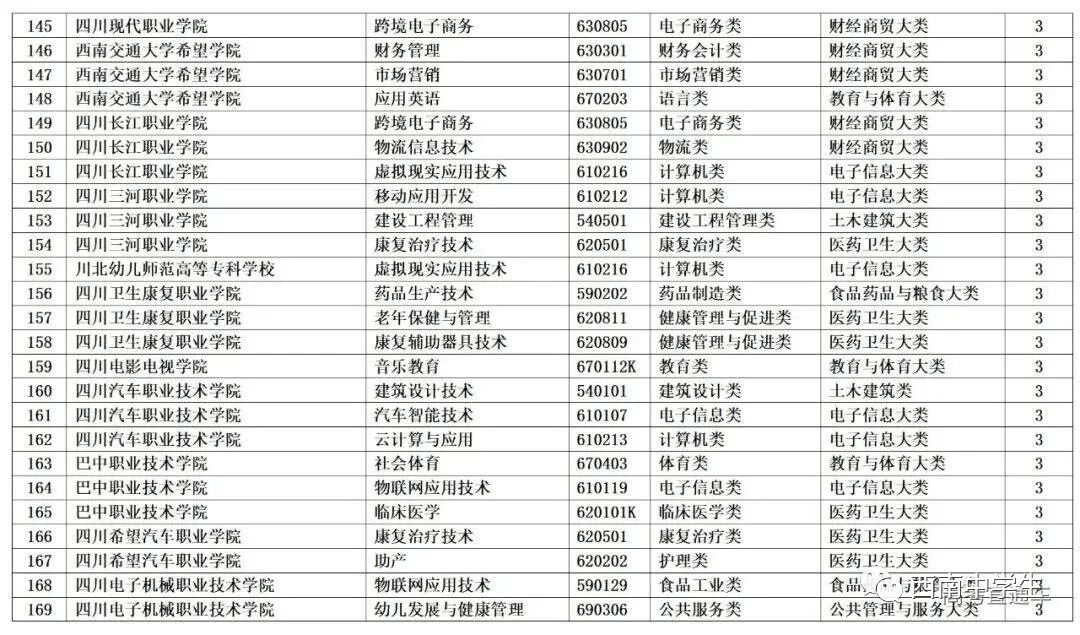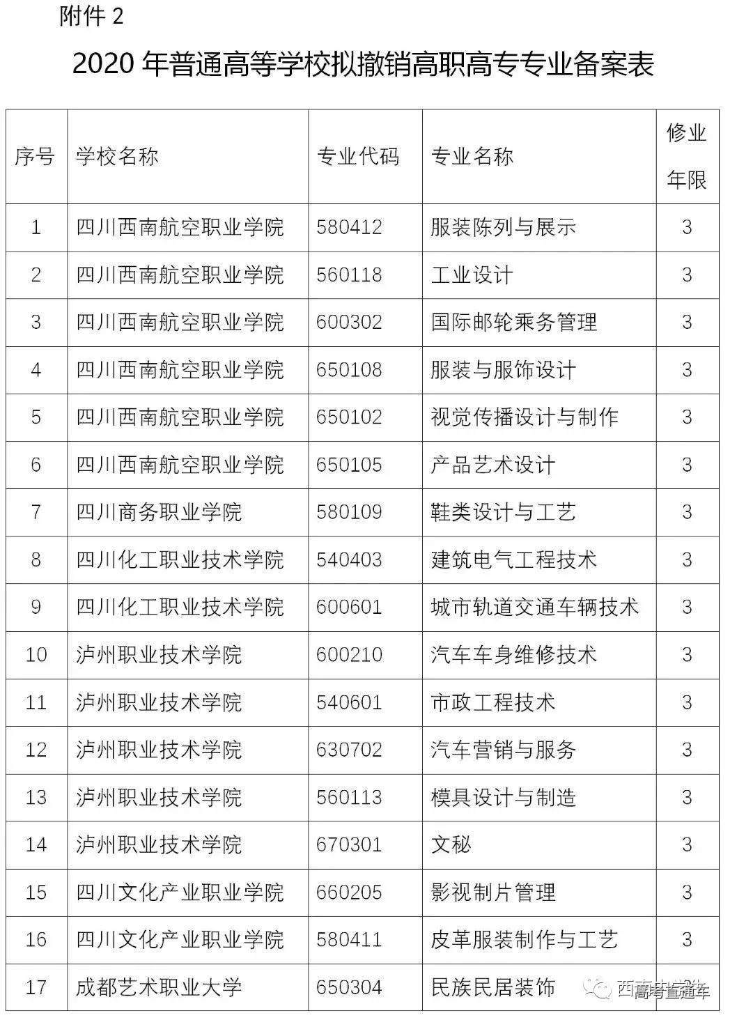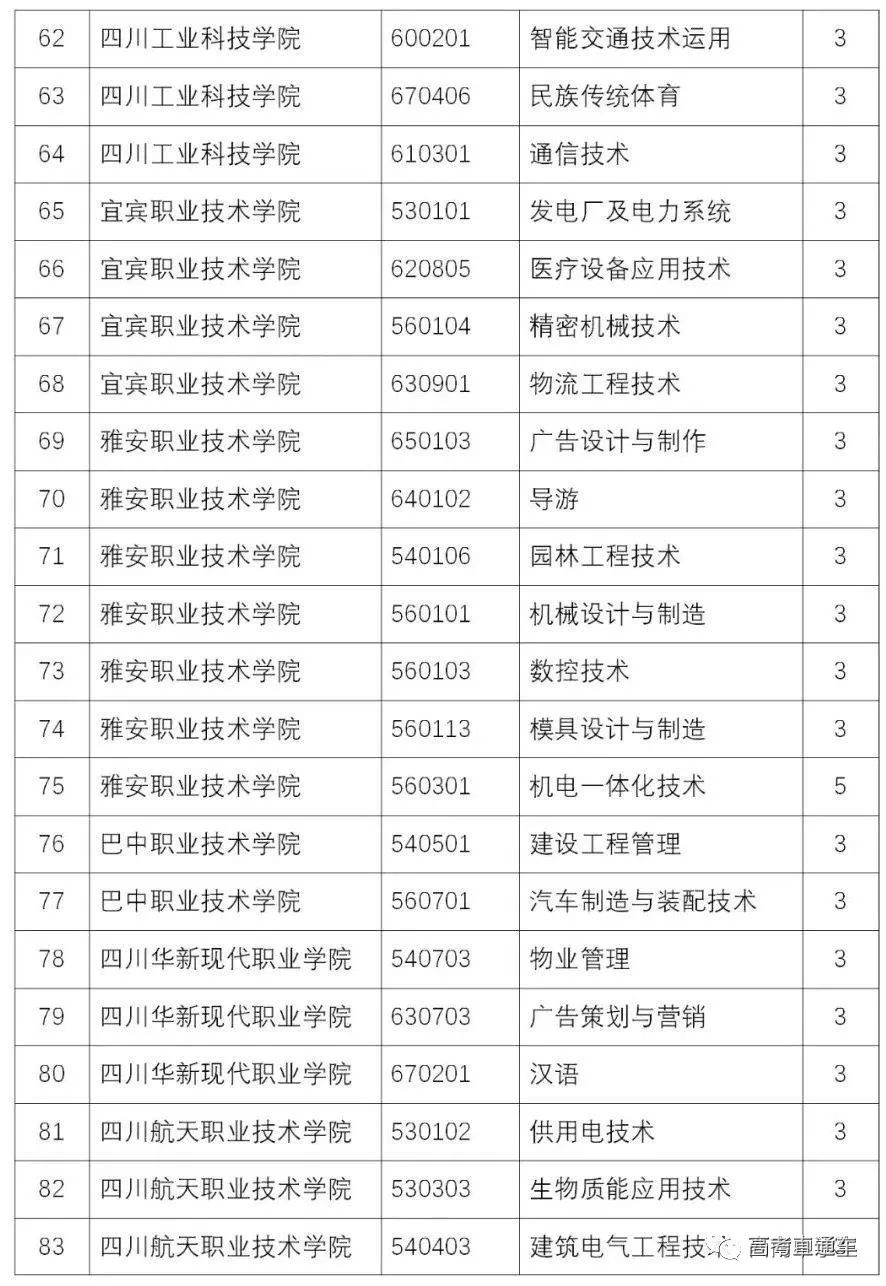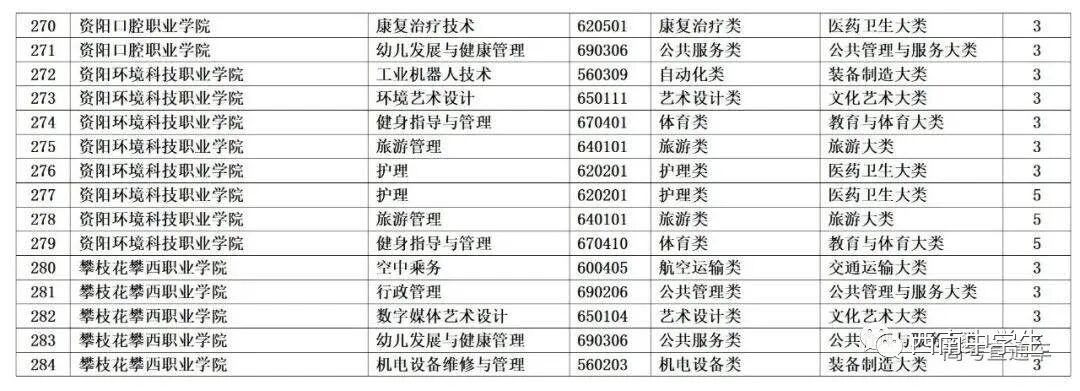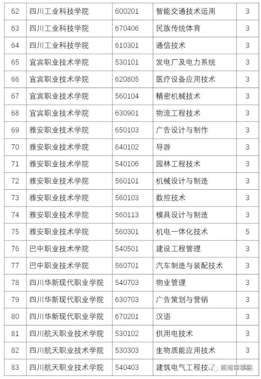 四川公布2020新设和撤销高职专业结果 有关高等学校: 根据《教育部关于公布2020年高等职业教育专业设置备案和审批结果的通知》(教职成函〔2020〕1号)精神,在我省有关高校申报2020年新设专业和拟招生专业备案的基础上,经教育部审批和省级审查,同意81所高校新增284个高职高专专业(含259个3年制,25个5年制,见附件1),同意27所高校撤销100个高职高专专业(见附件2),并对111所高校2020年拟招生高职高专专业予以公布(见附件3)。请各有关高校严格按照本通知公布的备案结果合理安排高职招生计划,已撤销和未同意备案的专业2020年不得安排招生。 希望各校进一步明确办学定位,调整优化专业结构,突出办学优势和特色,落实新设专业关于资金、师资、课程等建设内容的承诺,围绕地方经济社会发展需求,加强专业内涵建设,确保拟招生专业的教学水平和人才培养质量。 四川省教育厅 2020年3月4日 附件1:新设高职高专专业备案表 长按二维码打开 回复“新增专业” 查看完整名单 附件2:拟撤销高职高专专业备案表 长按二维码打开 回复“新增专业” 查看完整名单 2020年四川拟招生高职高专专业备案表 由于2020拟招生专业名单较多, 篇幅限制, 完整名单请在后台回复查看。 长按二维码打开 回复“新增专业” 查看完整名单 2020年,四川哪些学校新增最多专业? 西南中学生(ID:sczxswx)通过分析整理以上数据为大家统计出了2020年四川新增专业最多的学校。 可以看出,新增最多专业的学校为江阳城建职业学院和眉山药科职业学院,分别各自新增了10个专业。天府新区通用航空职业学院新增9个专业,天府新区航空旅游职业学院、天府新区信息职业学院、资阳环境科技职业学院各新增了8个专业。四川工业科技学院新增了7个专业。 那这几个学校分别都新增了什么专业呢? 长按二维码打开 回复“新增专业” 查看完整名单 2020年,四川哪些高职专业新增最多? 以下表格只统计四川2020年各高校新增5个以上高职高专专业名单。 可以看出,2020四川新增最多的高职高专专业为幼儿发展与健康管理,一共有12所高校开设,其次是护理专业,一共有10个高校开设,接下来是跨境电子商务,一共有9个学校。 2020年,四川哪些高职高专专业被撤销最多? 你读的专业被撤销了吗? 长按二维码打开 回复“新增专业” 查看完整名单