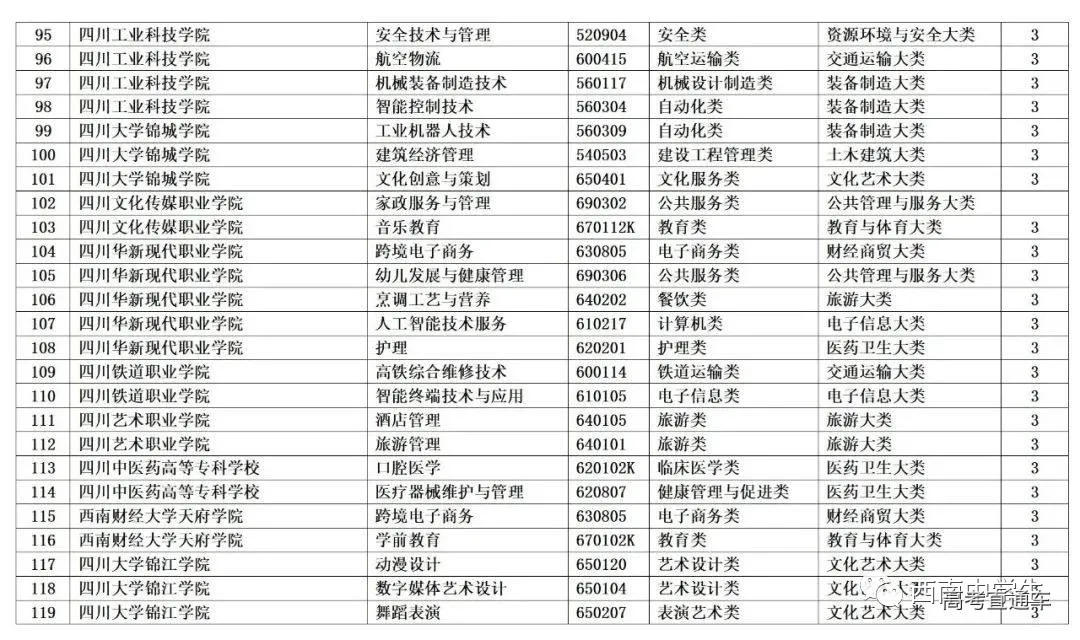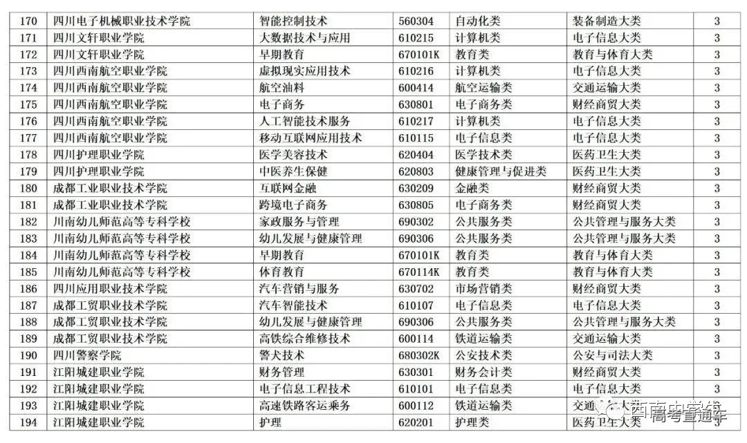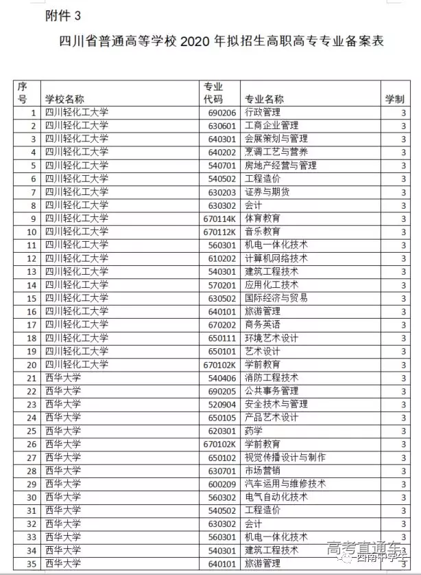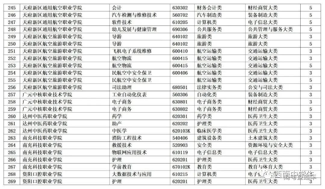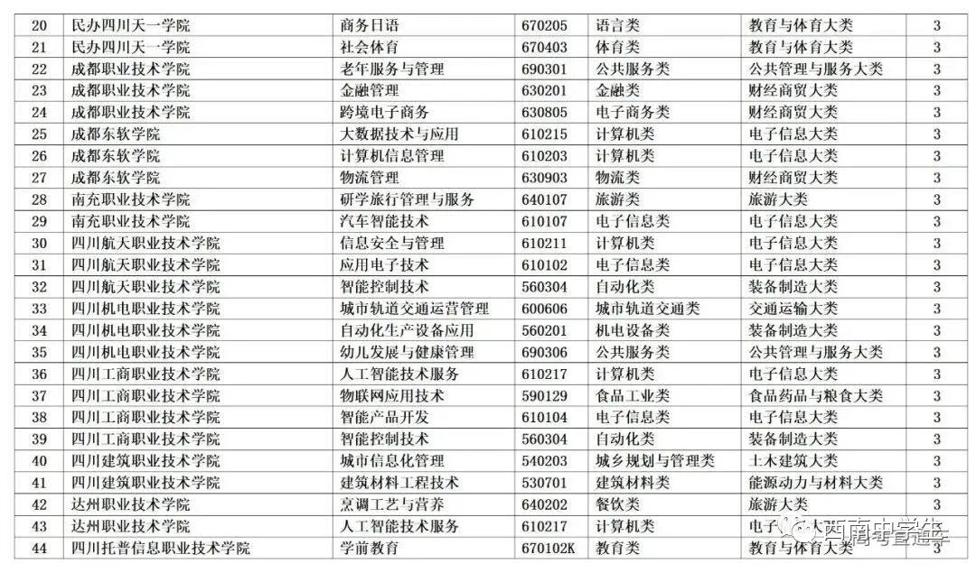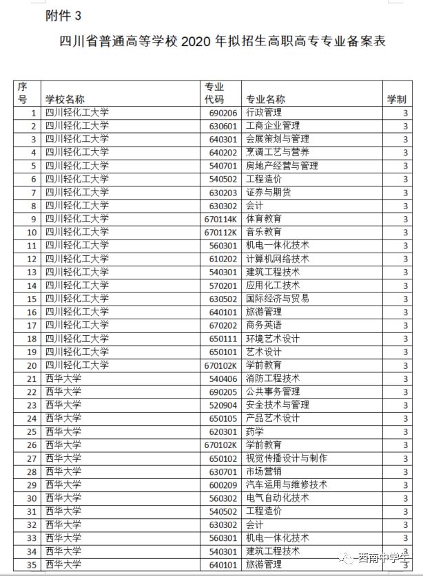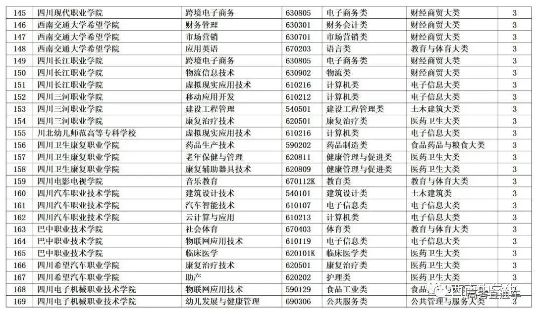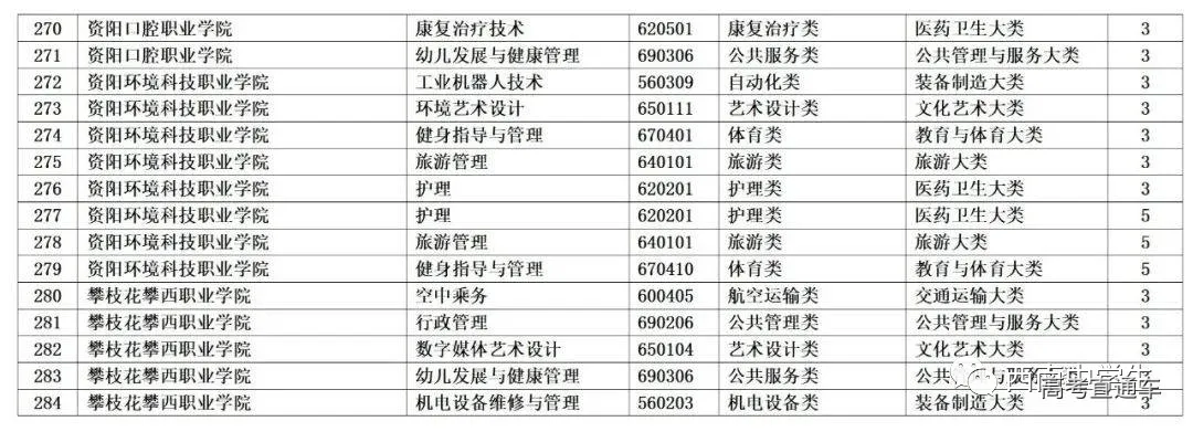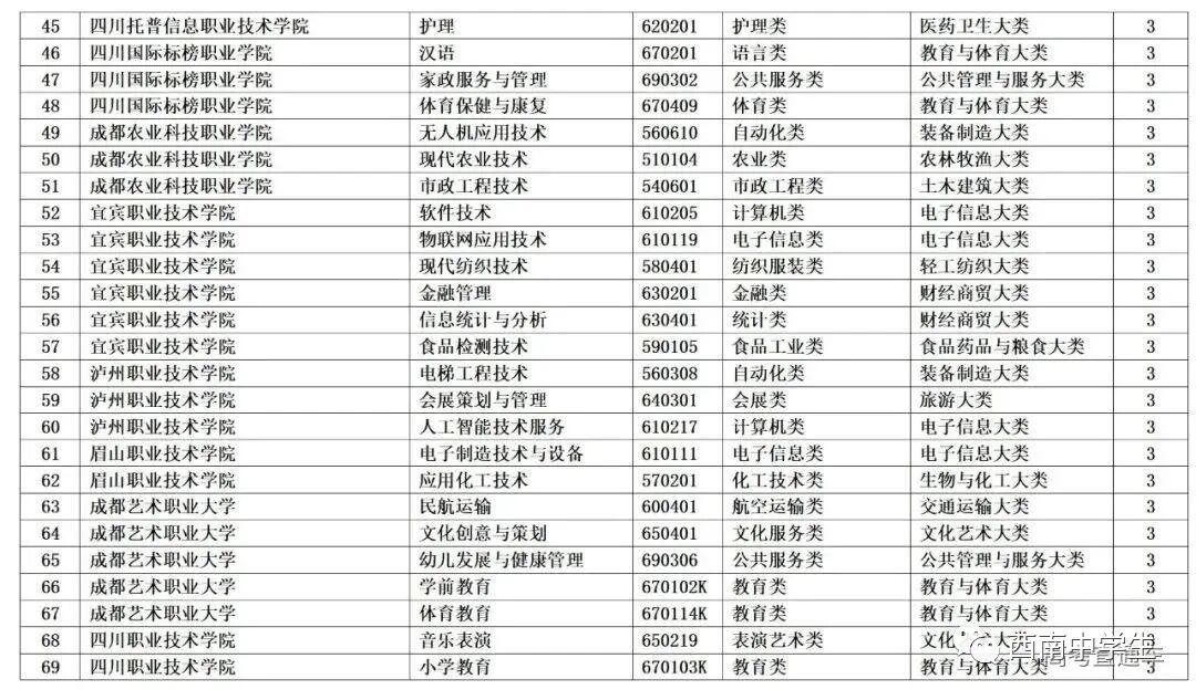 四川公布2020新设和撤销高职专业结果 有关高等学校: 根据《教育部关于公布2020年高等职业教育专业设置备案和审批结果的通知》(教职成函〔2020〕1号)精神,在我省有关高校申报2020年新设专业和拟招生专业备案的基础上,经教育部审批和省级审查,同意81所高校新增284个高职高专专业(含259个3年制,25个5年制,见附件1),同意27所高校撤销100个高职高专专业(见附件2),并对111所高校2020年拟招生高职高专专业予以公布(见附件3)。请各有关高校严格按照本通知公布的备案结果合理安排高职招生计划,已撤销和未同意备案的专业2020年不得安排招生。 希望各校进一步明确办学定位,调整优化专业结构,突出办学优势和特色,落实新设专业关于资金、师资、课程等建设内容的承诺,围绕地方经济社会发展需求,加强专业内涵建设,确保拟招生专业的教学水平和人才培养质量。 四川省教育厅 2020年3月4日 附件1:新设高职高专专业备案表 长按二维码打开 回复“新增专业” 查看完整名单 附件2:拟撤销高职高专专业备案表 长按二维码打开 回复“新增专业” 查看完整名单 2020年四川拟招生高职高专专业备案表 由于2020拟招生专业名单较多, 篇幅限制, 完整名单请在后台回复查看。 长按二维码打开 回复“新增专业” 查看完整名单 2020年,四川哪些学校新增最多专业? 西南中学生(ID:sczxswx)通过分析整理以上数据为大家统计出了2020年四川新增专业最多的学校。 可以看出,新增最多专业的学校为江阳城建职业学院和眉山药科职业学院,分别各自新增了10个专业。天府新区通用航空职业学院新增9个专业,天府新区航空旅游职业学院、天府新区信息职业学院、资阳环境科技职业学院各新增了8个专业。四川工业科技学院新增了7个专业。 那这几个学校分别都新增了什么专业呢? 长按二维码打开 回复“新增专业” 查看完整名单 2020年,四川哪些高职专业新增最多? 以下表格只统计四川2020年各高校新增5个以上高职高专专业名单。 可以看出,2020四川新增最多的高职高专专业为幼儿发展与健康管理,一共有12所高校开设,其次是护理专业,一共有10个高校开设,接下来是跨境电子商务,一共有9个学校。 2020年,四川哪些高职高专专业被撤销最多? 你读的专业被撤销了吗? 长按二维码打开 回复“新增专业” 查看完整名单