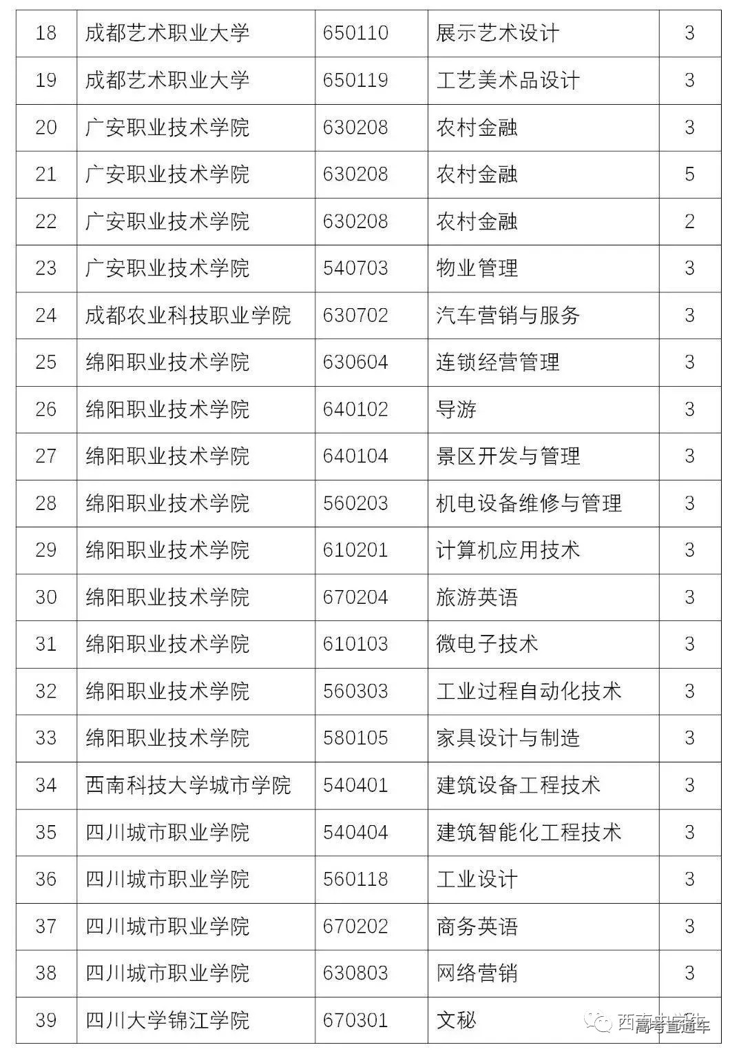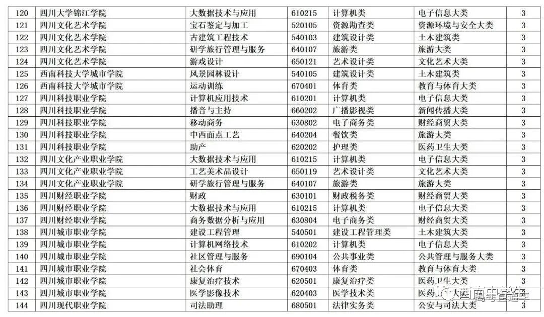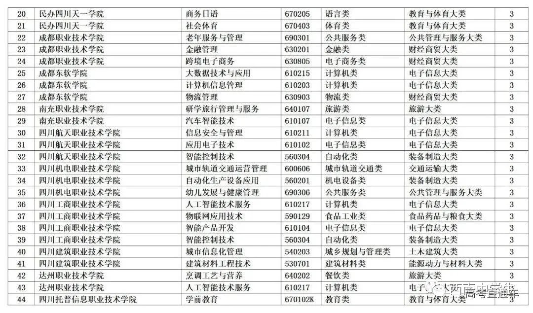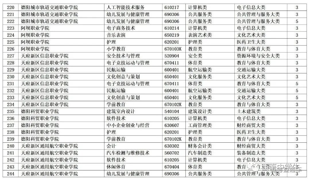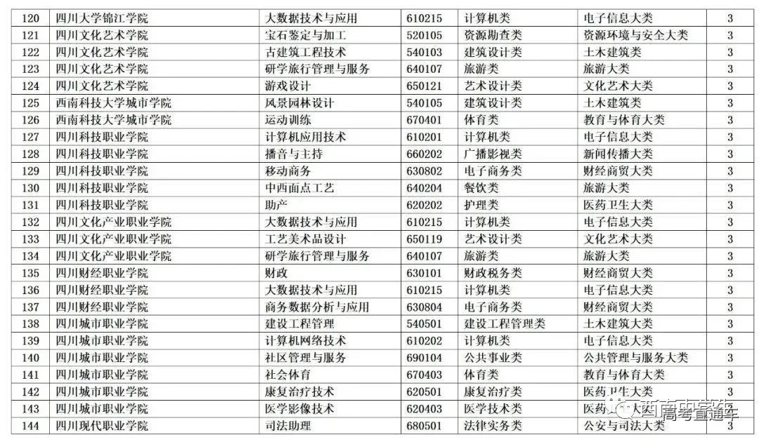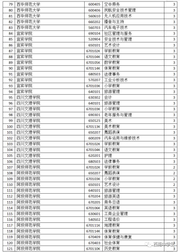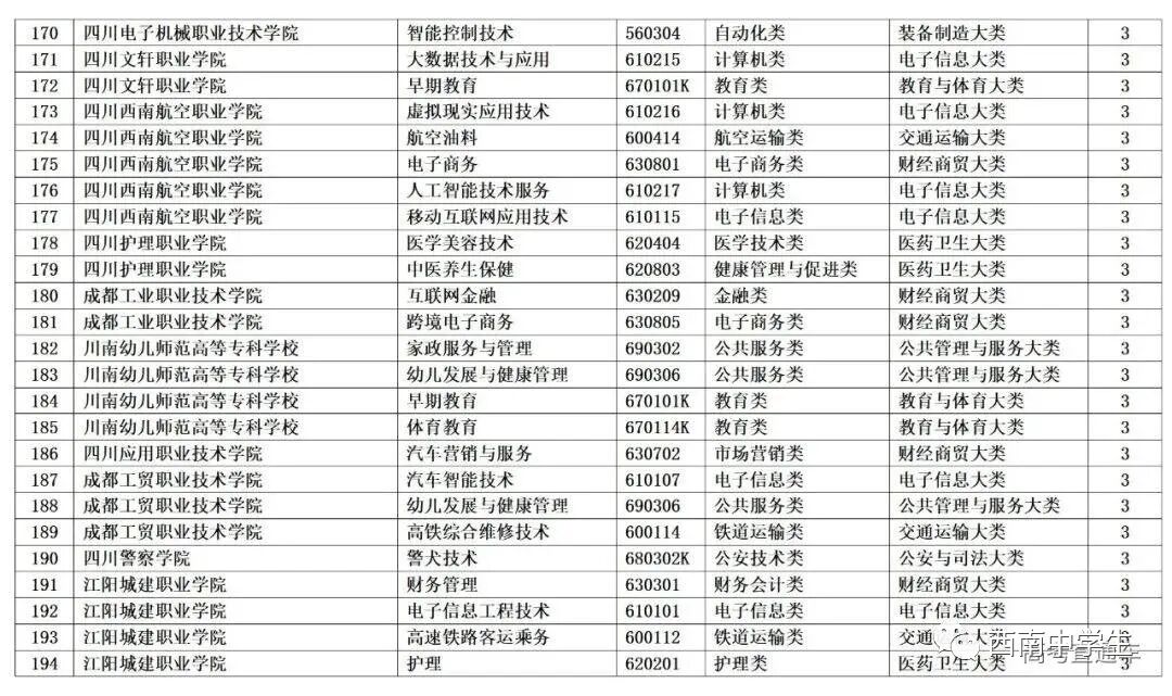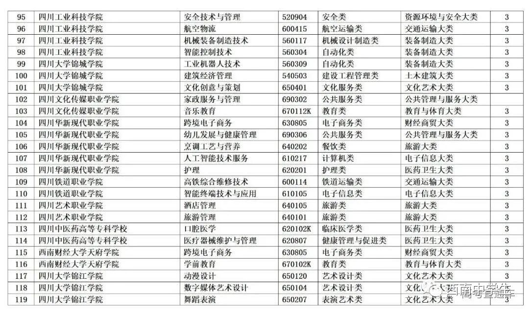 四川公布2020新设和撤销高职专业结果 有关高等学校: 根据《教育部关于公布2020年高等职业教育专业设置备案和审批结果的通知》(教职成函〔2020〕1号)精神,在我省有关高校申报2020年新设专业和拟招生专业备案的基础上,经教育部审批和省级审查,同意81所高校新增284个高职高专专业(含259个3年制,25个5年制,见附件1),同意27所高校撤销100个高职高专专业(见附件2),并对111所高校2020年拟招生高职高专专业予以公布(见附件3)。请各有关高校严格按照本通知公布的备案结果合理安排高职招生计划,已撤销和未同意备案的专业2020年不得安排招生。 希望各校进一步明确办学定位,调整优化专业结构,突出办学优势和特色,落实新设专业关于资金、师资、课程等建设内容的承诺,围绕地方经济社会发展需求,加强专业内涵建设,确保拟招生专业的教学水平和人才培养质量。 四川省教育厅 2020年3月4日 附件1:新设高职高专专业备案表 长按二维码打开 回复“新增专业” 查看完整名单 附件2:拟撤销高职高专专业备案表 长按二维码打开 回复“新增专业” 查看完整名单 2020年四川拟招生高职高专专业备案表 由于2020拟招生专业名单较多, 篇幅限制, 完整名单请在后台回复查看。 长按二维码打开 回复“新增专业” 查看完整名单 2020年,四川哪些学校新增最多专业? 西南中学生(ID:sczxswx)通过分析整理以上数据为大家统计出了2020年四川新增专业最多的学校。 可以看出,新增最多专业的学校为江阳城建职业学院和眉山药科职业学院,分别各自新增了10个专业。天府新区通用航空职业学院新增9个专业,天府新区航空旅游职业学院、天府新区信息职业学院、资阳环境科技职业学院各新增了8个专业。四川工业科技学院新增了7个专业。 那这几个学校分别都新增了什么专业呢? 长按二维码打开 回复“新增专业” 查看完整名单 2020年,四川哪些高职专业新增最多? 以下表格只统计四川2020年各高校新增5个以上高职高专专业名单。 可以看出,2020四川新增最多的高职高专专业为幼儿发展与健康管理,一共有12所高校开设,其次是护理专业,一共有10个高校开设,接下来是跨境电子商务,一共有9个学校。 2020年,四川哪些高职高专专业被撤销最多? 你读的专业被撤销了吗? 长按二维码打开 回复“新增专业” 查看完整名单