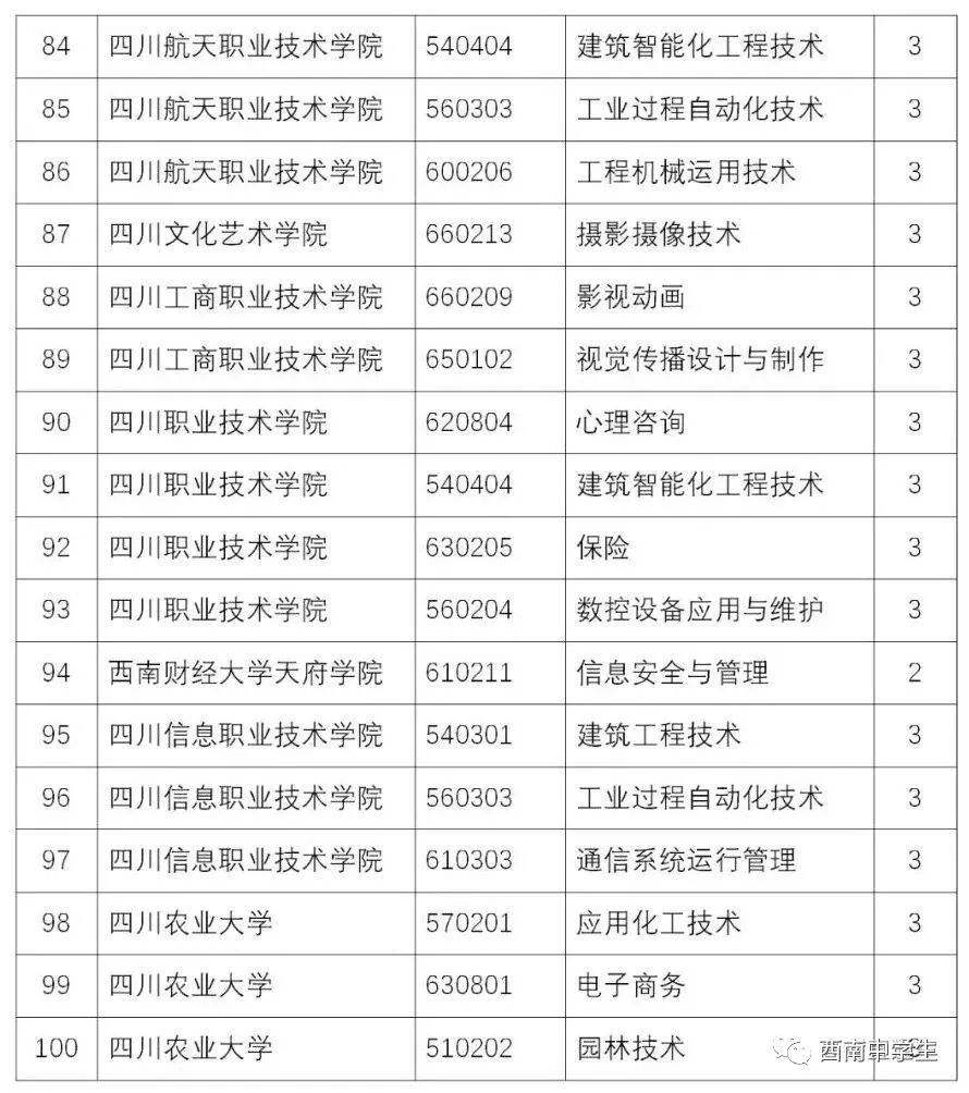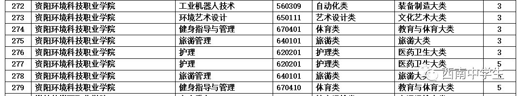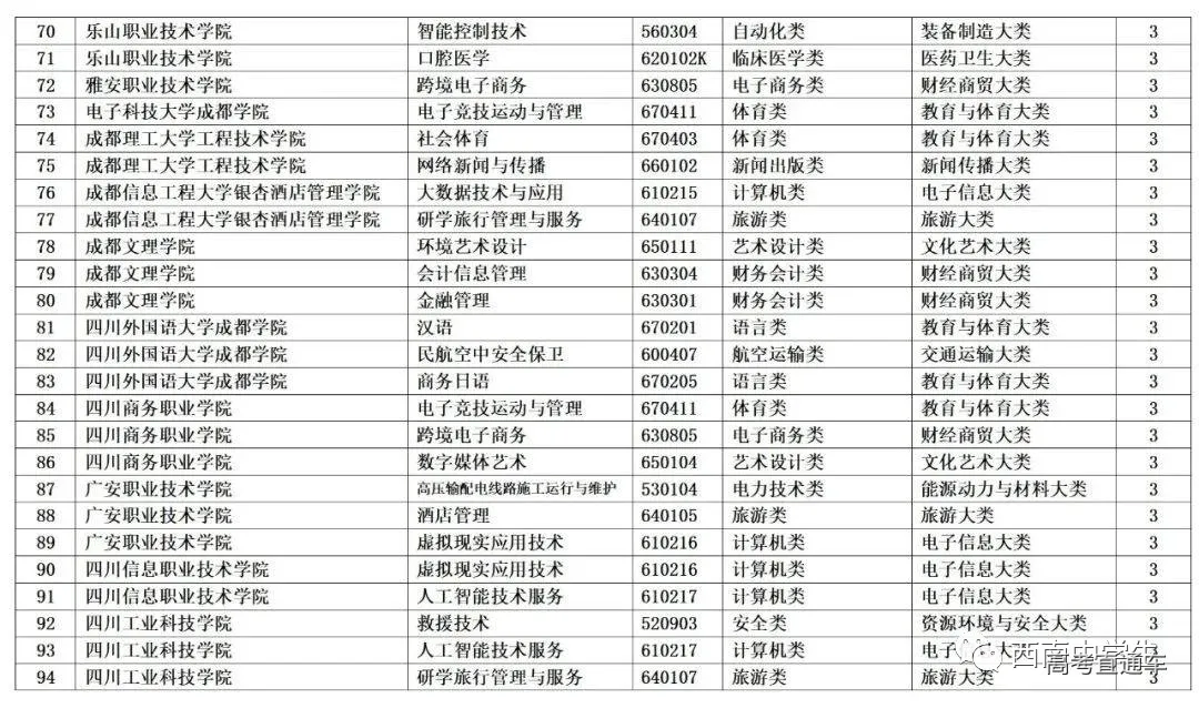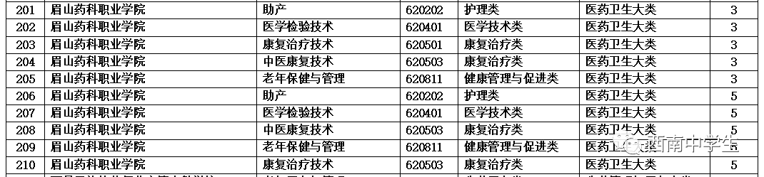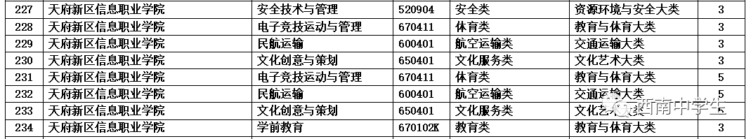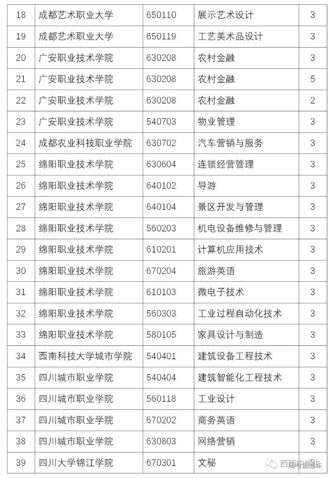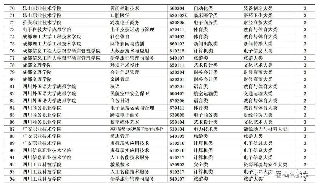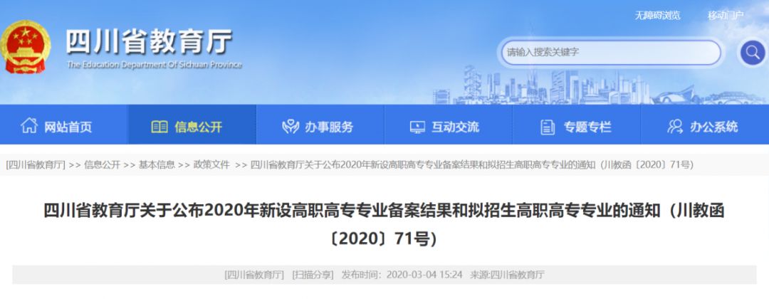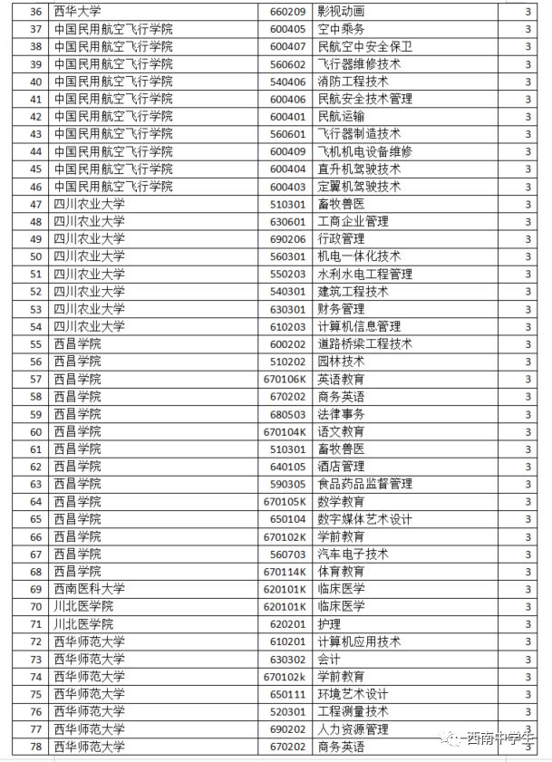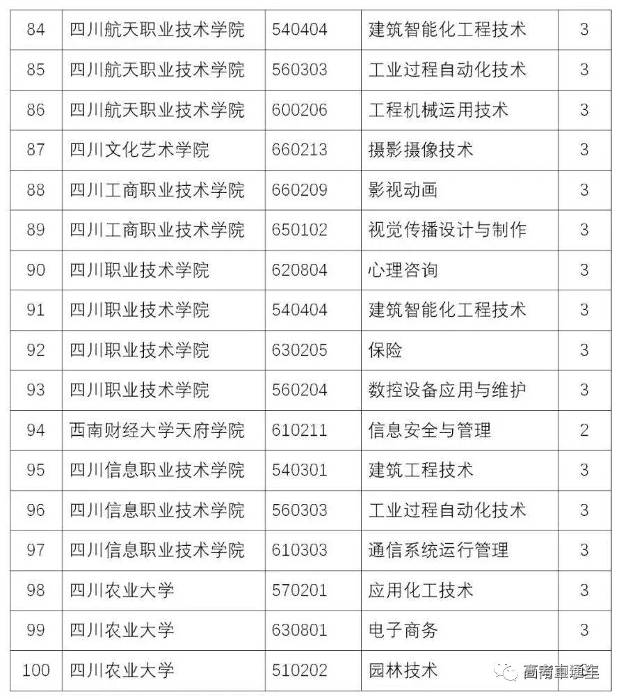 四川公布2020新设和撤销高职专业结果 有关高等学校: 根据《教育部关于公布2020年高等职业教育专业设置备案和审批结果的通知》(教职成函〔2020〕1号)精神,在我省有关高校申报2020年新设专业和拟招生专业备案的基础上,经教育部审批和省级审查,同意81所高校新增284个高职高专专业(含259个3年制,25个5年制,见附件1),同意27所高校撤销100个高职高专专业(见附件2),并对111所高校2020年拟招生高职高专专业予以公布(见附件3)。请各有关高校严格按照本通知公布的备案结果合理安排高职招生计划,已撤销和未同意备案的专业2020年不得安排招生。 希望各校进一步明确办学定位,调整优化专业结构,突出办学优势和特色,落实新设专业关于资金、师资、课程等建设内容的承诺,围绕地方经济社会发展需求,加强专业内涵建设,确保拟招生专业的教学水平和人才培养质量。 四川省教育厅 2020年3月4日 附件1:新设高职高专专业备案表 长按二维码打开 回复“新增专业” 查看完整名单 附件2:拟撤销高职高专专业备案表 长按二维码打开 回复“新增专业” 查看完整名单 2020年四川拟招生高职高专专业备案表 由于2020拟招生专业名单较多, 篇幅限制, 完整名单请在后台回复查看。 长按二维码打开 回复“新增专业” 查看完整名单 2020年,四川哪些学校新增最多专业? 西南中学生(ID:sczxswx)通过分析整理以上数据为大家统计出了2020年四川新增专业最多的学校。 可以看出,新增最多专业的学校为江阳城建职业学院和眉山药科职业学院,分别各自新增了10个专业。天府新区通用航空职业学院新增9个专业,天府新区航空旅游职业学院、天府新区信息职业学院、资阳环境科技职业学院各新增了8个专业。四川工业科技学院新增了7个专业。 那这几个学校分别都新增了什么专业呢? 长按二维码打开 回复“新增专业” 查看完整名单 2020年,四川哪些高职专业新增最多? 以下表格只统计四川2020年各高校新增5个以上高职高专专业名单。 可以看出,2020四川新增最多的高职高专专业为幼儿发展与健康管理,一共有12所高校开设,其次是护理专业,一共有10个高校开设,接下来是跨境电子商务,一共有9个学校。 2020年,四川哪些高职高专专业被撤销最多? 你读的专业被撤销了吗? 长按二维码打开 回复“新增专业” 查看完整名单