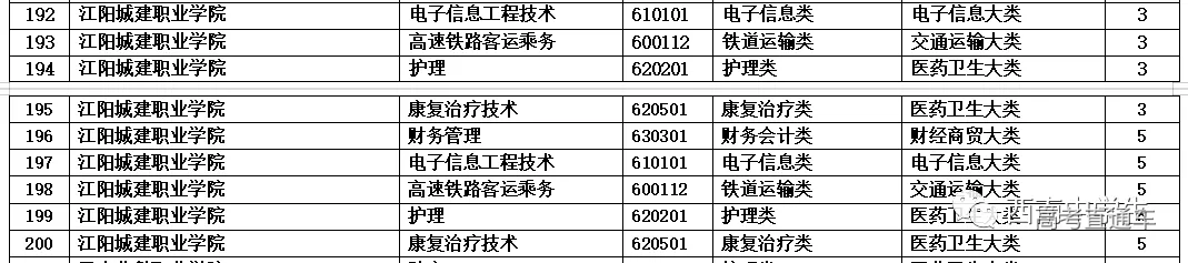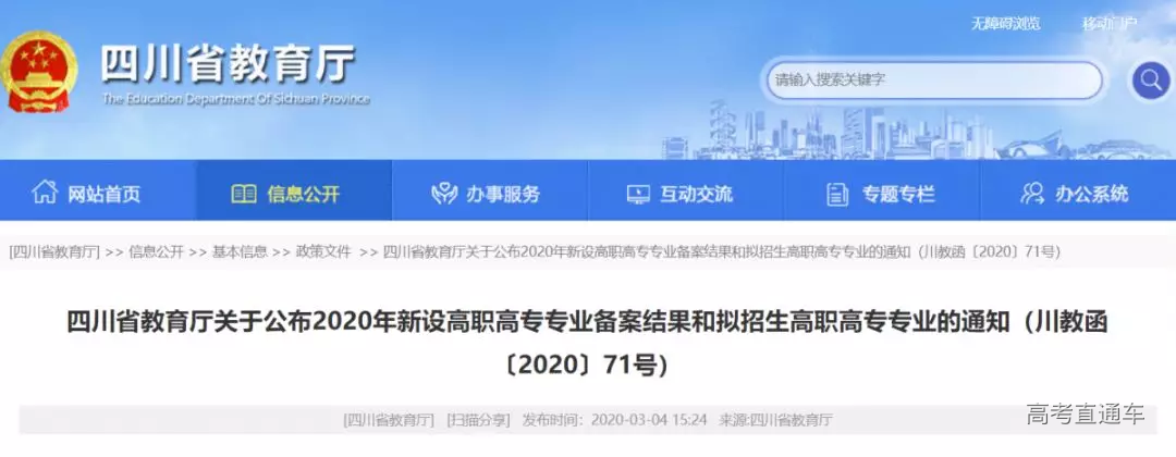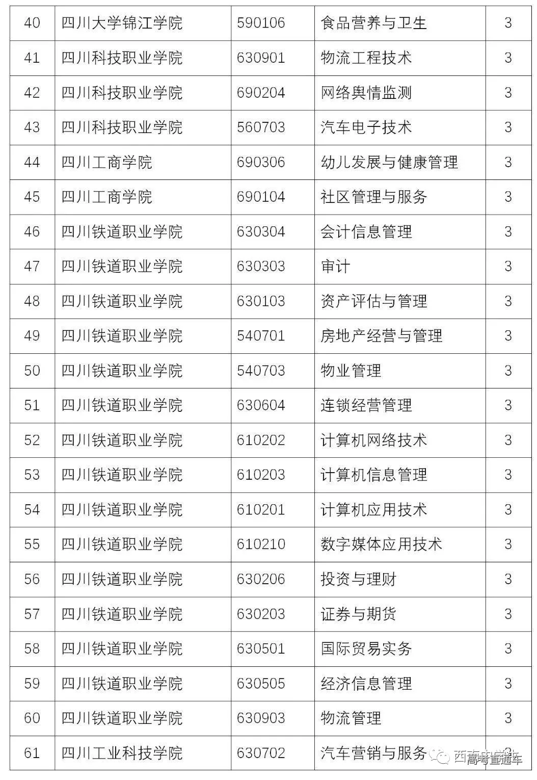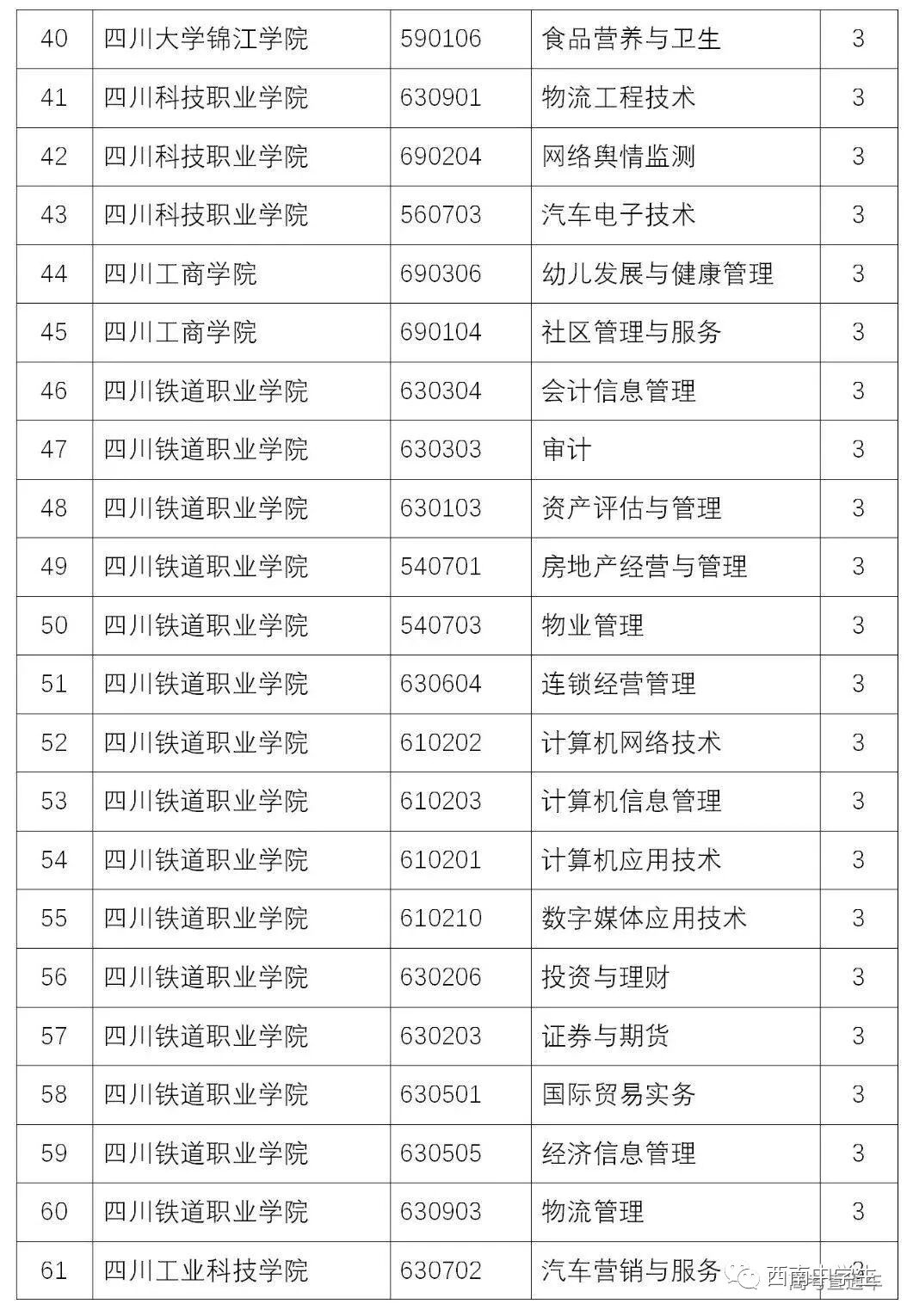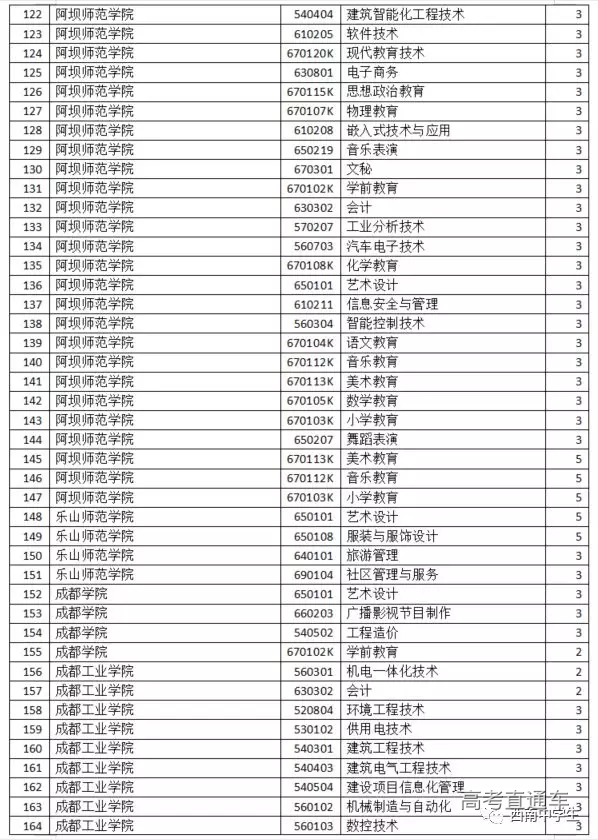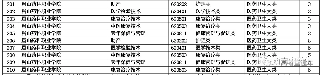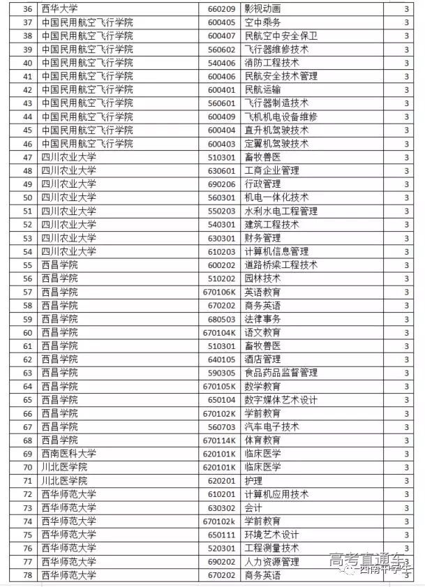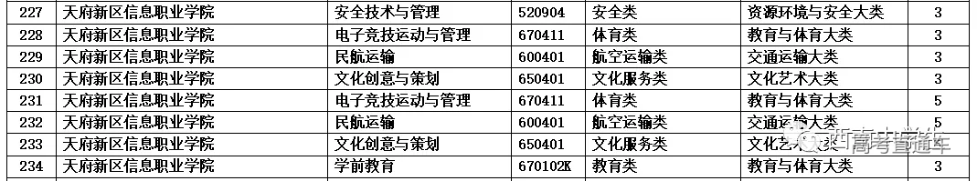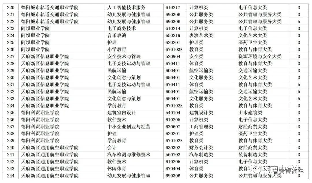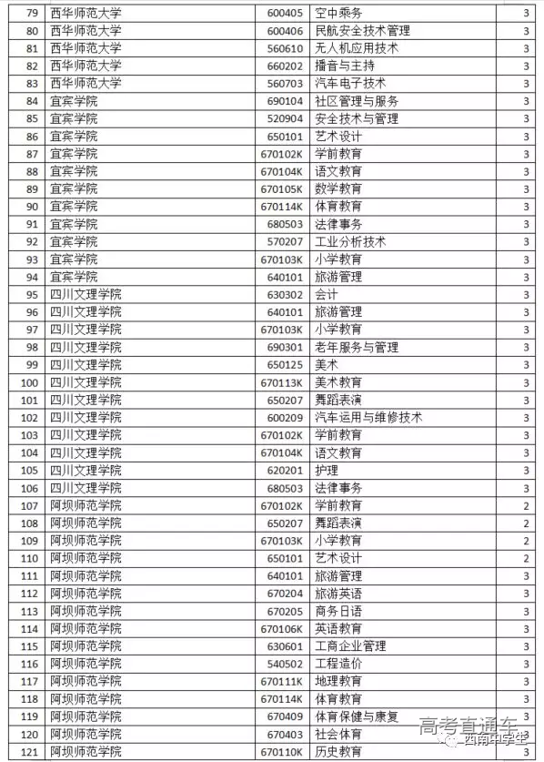 四川公布2020新设和撤销高职专业结果 有关高等学校: 根据《教育部关于公布2020年高等职业教育专业设置备案和审批结果的通知》(教职成函〔2020〕1号)精神,在我省有关高校申报2020年新设专业和拟招生专业备案的基础上,经教育部审批和省级审查,同意81所高校新增284个高职高专专业(含259个3年制,25个5年制,见附件1),同意27所高校撤销100个高职高专专业(见附件2),并对111所高校2020年拟招生高职高专专业予以公布(见附件3)。请各有关高校严格按照本通知公布的备案结果合理安排高职招生计划,已撤销和未同意备案的专业2020年不得安排招生。 希望各校进一步明确办学定位,调整优化专业结构,突出办学优势和特色,落实新设专业关于资金、师资、课程等建设内容的承诺,围绕地方经济社会发展需求,加强专业内涵建设,确保拟招生专业的教学水平和人才培养质量。 四川省教育厅 2020年3月4日 附件1:新设高职高专专业备案表 长按二维码打开 回复“新增专业” 查看完整名单 附件2:拟撤销高职高专专业备案表 长按二维码打开 回复“新增专业” 查看完整名单 2020年四川拟招生高职高专专业备案表 由于2020拟招生专业名单较多, 篇幅限制, 完整名单请在后台回复查看。 长按二维码打开 回复“新增专业” 查看完整名单 2020年,四川哪些学校新增最多专业? 西南中学生(ID:sczxswx)通过分析整理以上数据为大家统计出了2020年四川新增专业最多的学校。 可以看出,新增最多专业的学校为江阳城建职业学院和眉山药科职业学院,分别各自新增了10个专业。天府新区通用航空职业学院新增9个专业,天府新区航空旅游职业学院、天府新区信息职业学院、资阳环境科技职业学院各新增了8个专业。四川工业科技学院新增了7个专业。 那这几个学校分别都新增了什么专业呢? 长按二维码打开 回复“新增专业” 查看完整名单 2020年,四川哪些高职专业新增最多? 以下表格只统计四川2020年各高校新增5个以上高职高专专业名单。 可以看出,2020四川新增最多的高职高专专业为幼儿发展与健康管理,一共有12所高校开设,其次是护理专业,一共有10个高校开设,接下来是跨境电子商务,一共有9个学校。 2020年,四川哪些高职高专专业被撤销最多? 你读的专业被撤销了吗? 长按二维码打开 回复“新增专业” 查看完整名单