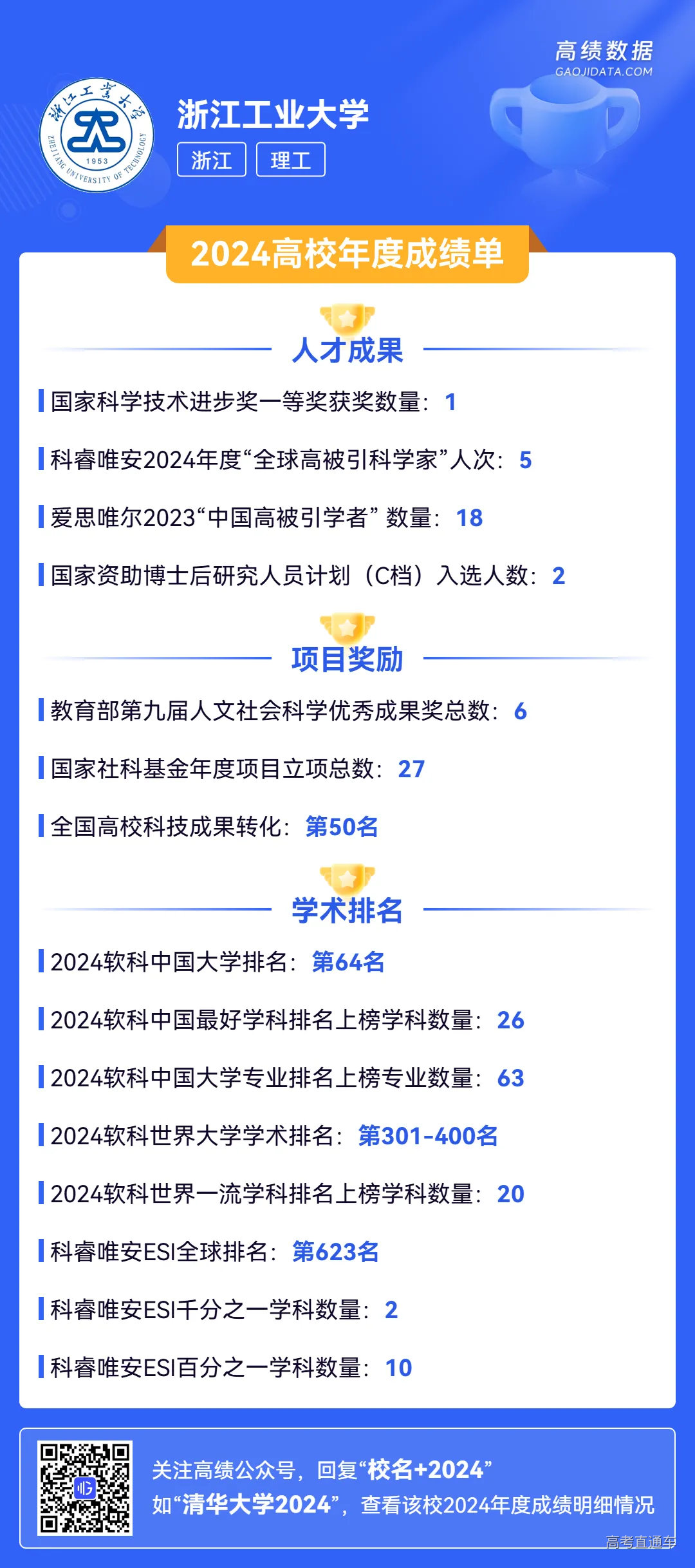 浙江工业大学 2023年度国奖结果中,仅有2所作为第一完成单位获得一等奖的地方高校,浙江工业大学就是其中之一。学校作为第一完成单位的“新型膜法水处理关键技术及应用”项目获得了国家科技进步奖一等奖。 而整体来看,浙江工业大学2024年成绩表现亮眼——在人才方面,浙江工业大学拥有科睿唯安2024年度“全球高被引科学家”5人次,爱思唯尔2023“中国高被引学者”18人,还有2位优秀的青年人才入选国家资助博士后研究人员计划(C档)。 在人文社科方面,学校也表现不俗,共计获得6项教育部第九届人文社会科学优秀成果奖,国家社科基金年度立项总数达27项。 在学术排名方面,学校冲上了2024软科中国大学排名第64位,还斩获了2个科睿唯安ESI千分之一学科和10个百分之一学科,成绩斐然。