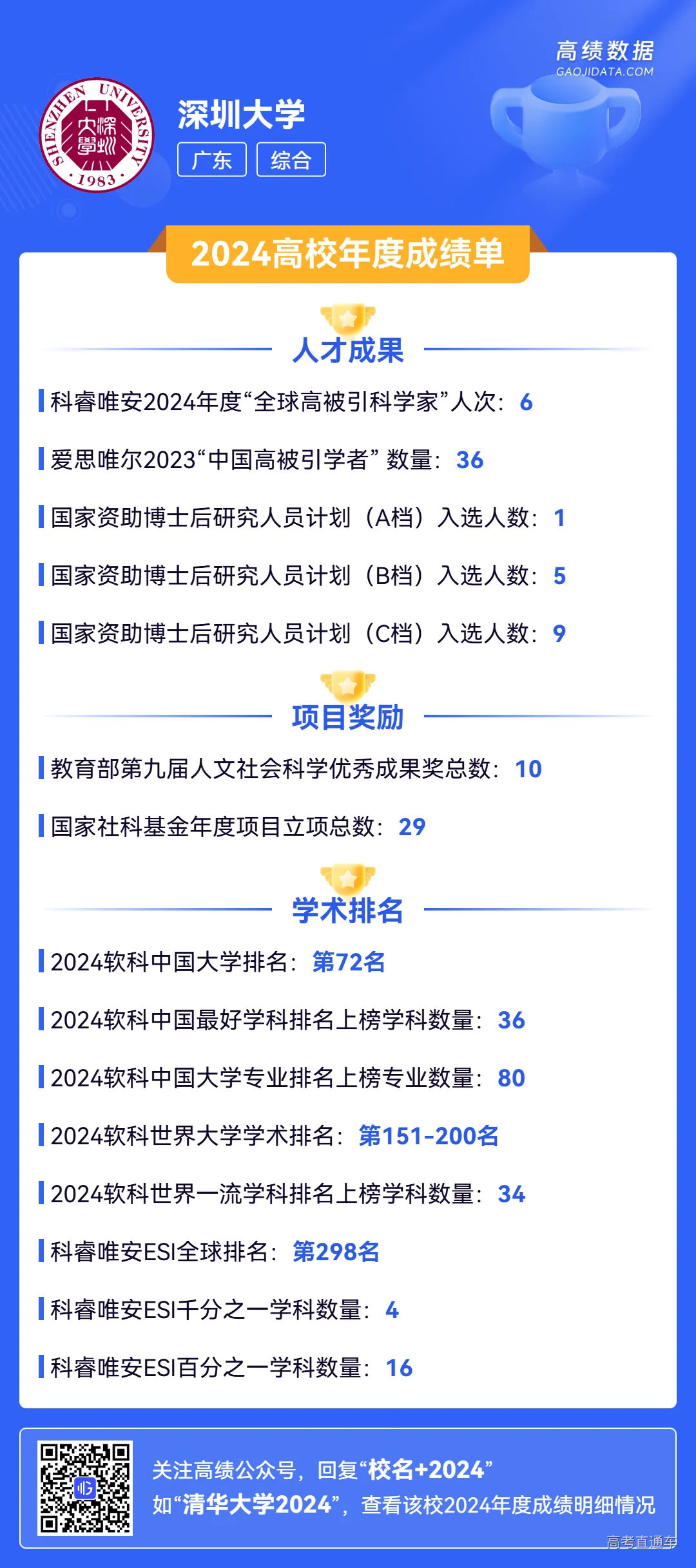 除了国奖获得者的高校外,还有部分学校展现出了强有力的国际科研水平,斩获多项成绩,交出了一份亮眼的年度成绩单。 深圳大学 深圳大学在国际学术实力方面表现十分抢眼。学校共有6人次入选科睿唯安2024年度“全球高被引科学家”,以及36人入选爱思唯尔2023“中国高被引学者”。 学校在2024软科世界大学学术排名中,跻身前200强;科睿唯安ESI全球排名中,跻身前300强,斩获了4个科睿唯安ESI千分之一学科和16个百分之一学科,可见学校在国际化办学方面取得了非常显著之成效。 作为一所位于改革开放前沿城市的大学,深圳大学高度重视与国际教育资源的对接与融合,积极引进海外优质教育资源,加强与国际知名大学的交流与合作。学校还重科研投入,拥有一批高水平的科研团队和实验室,取得了多项具有国际影响力的科研成果。