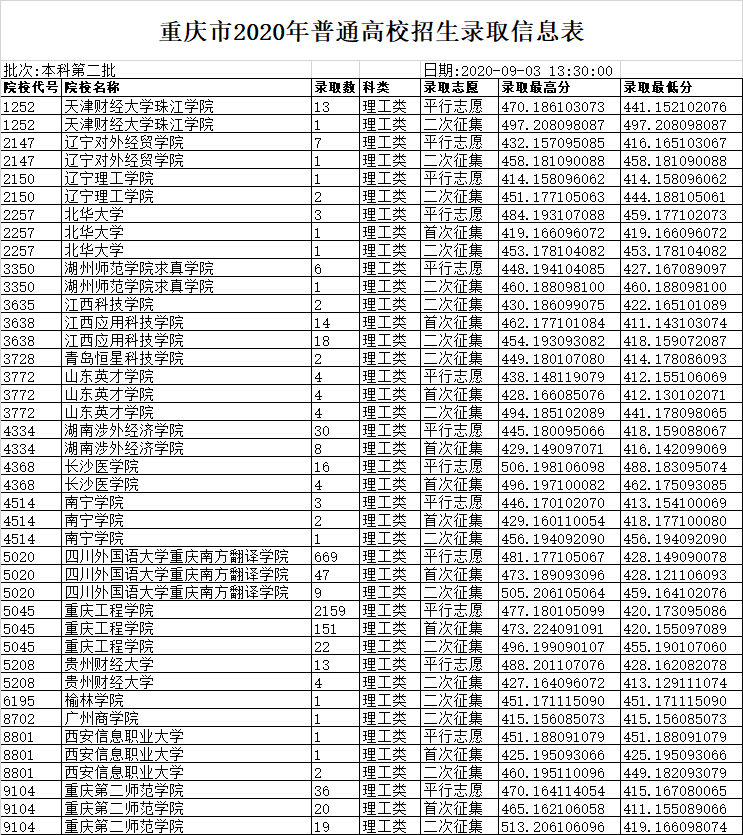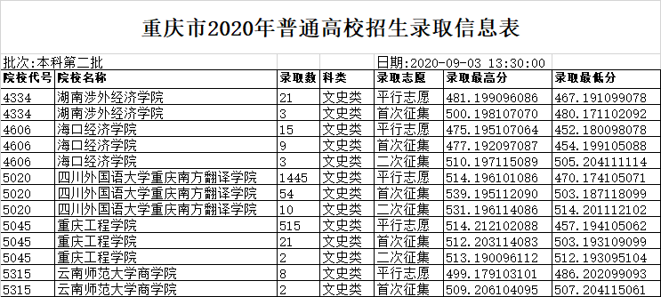 重庆市2020年普通高校招生本科第二批录取信息表(四)
