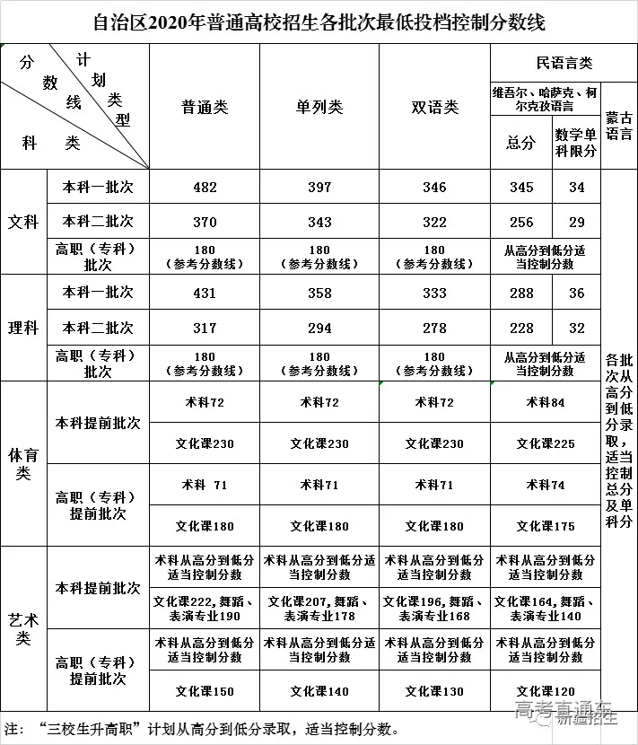 7月26日,自治区招生委员会召开全体会议,根据区内外普通高校在疆招生计划数、考生成绩、录取投档方式等因素,审议确定自治区2020年普通高校招生各批次最低投档控制分数线,现正式公布。