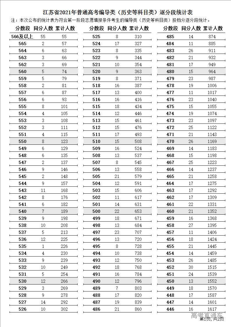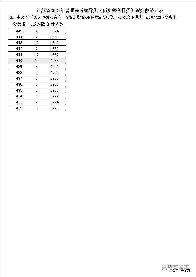江苏省2021年普通高考编导类(历史等科目类)逐分段统计表