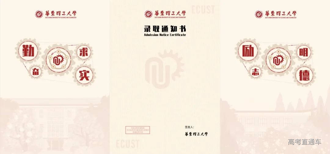 华东理工大学录取通知书以“轮转芯连,心系华理”为主题。通知书的封面设计引用华理特色的齿轮元素,外形融入华理特色建筑,内圈采用“华东理工大学”二进制编码,环绕着华理英文缩写及校徽。录取通知书礼盒中有华容道小游戏、黄铜书签、卡套、明信片等精致美观、实用悦目的文创周边,将陪伴同学们步入华理的学习生活。