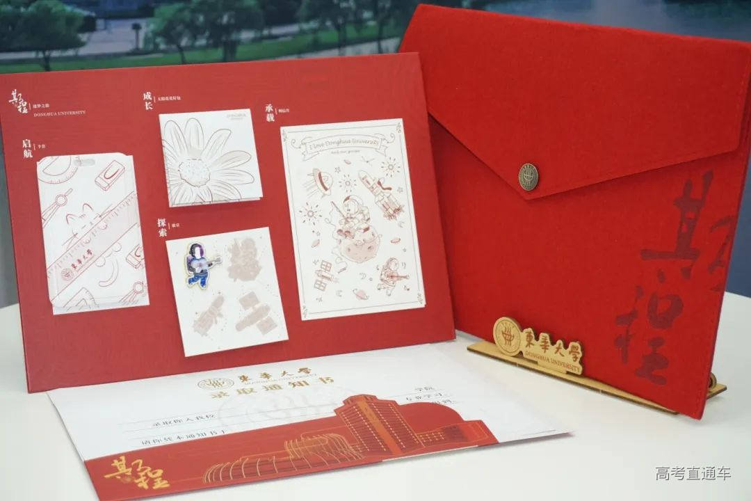 东华大学录取通知书以象征“起航”的红色作为主色调,期待与即将入学的学子们共同开启新的征程。礼盒内装有饱含祝福的小礼物——卡套、太阳花花籽包、徽章与明信片,祝愿学子们能在未来的求学过程中勇攀高峰、挑战自我。