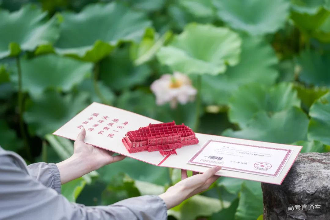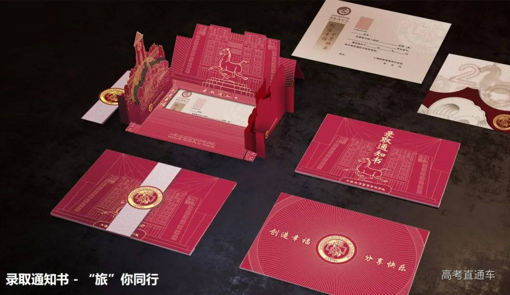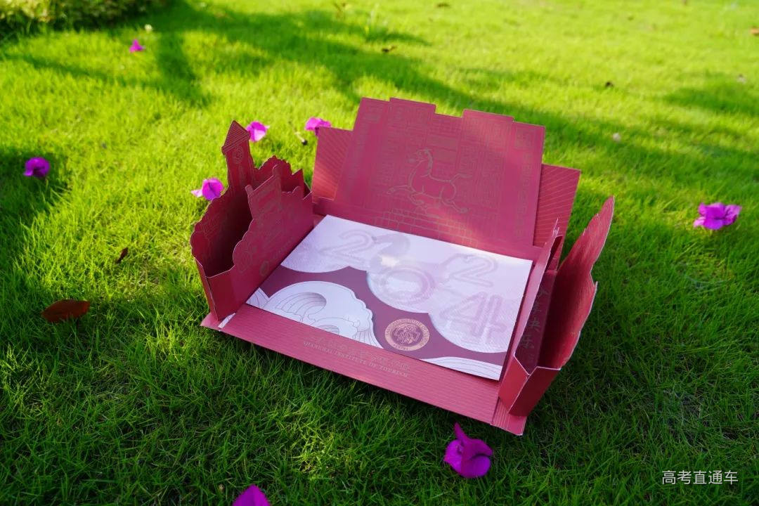 上海旅游高等专科学校录取通知书采用立体折纸工艺,将各种校内不同标志性建筑“搬”于纸上,折起后呈现出包围式的效果,围绕着被录取同学的姓名、录取专业等信息,代表了上海旅专大家庭对新生的欢迎。