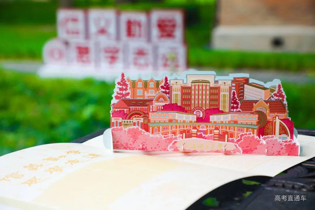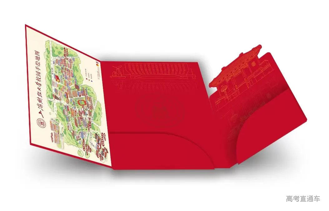 上海对外经贸大学录取通知书以深红色为主,校园美景插画下方内置校长寄语卡片。蓝红撞色新生礼包,内含2枚定制金属书签。连续第三年“校长赠书”升级为电子书,彰显环保时尚理念,邀请新生们开启数字书香之旅。