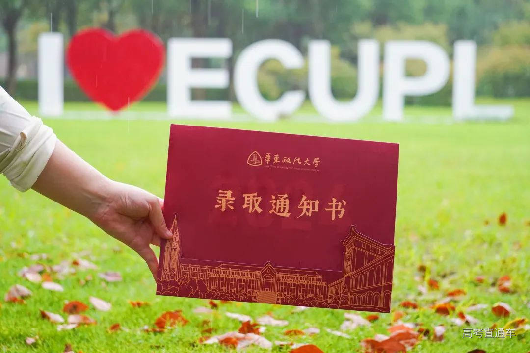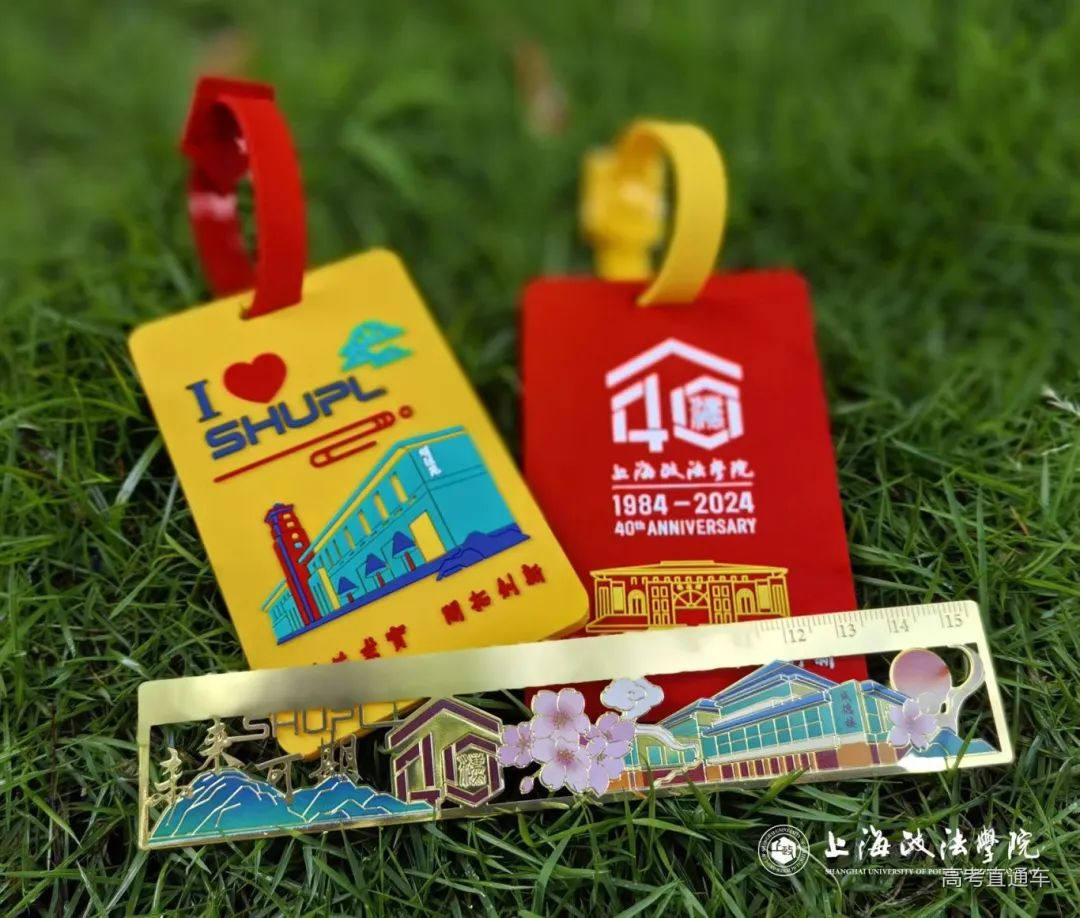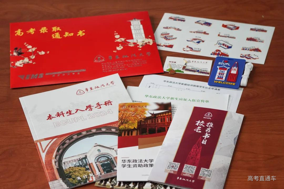 华东政法大学录取通知书采用三折页不规则裁切设计,兼具展示和收藏的功能。设计包含长宁校区韬奋楼、松江校区明珠楼两栋建筑、校徽、录取通知书等字样,背面则是华政校训“笃行致知 明德崇法”。同时,今年的新生大礼包以“知识与梦想的桥梁”为理念,将校长推荐书目,校园建筑物金属书签,以及融入法律元素的行李牌,送给每一位新生。