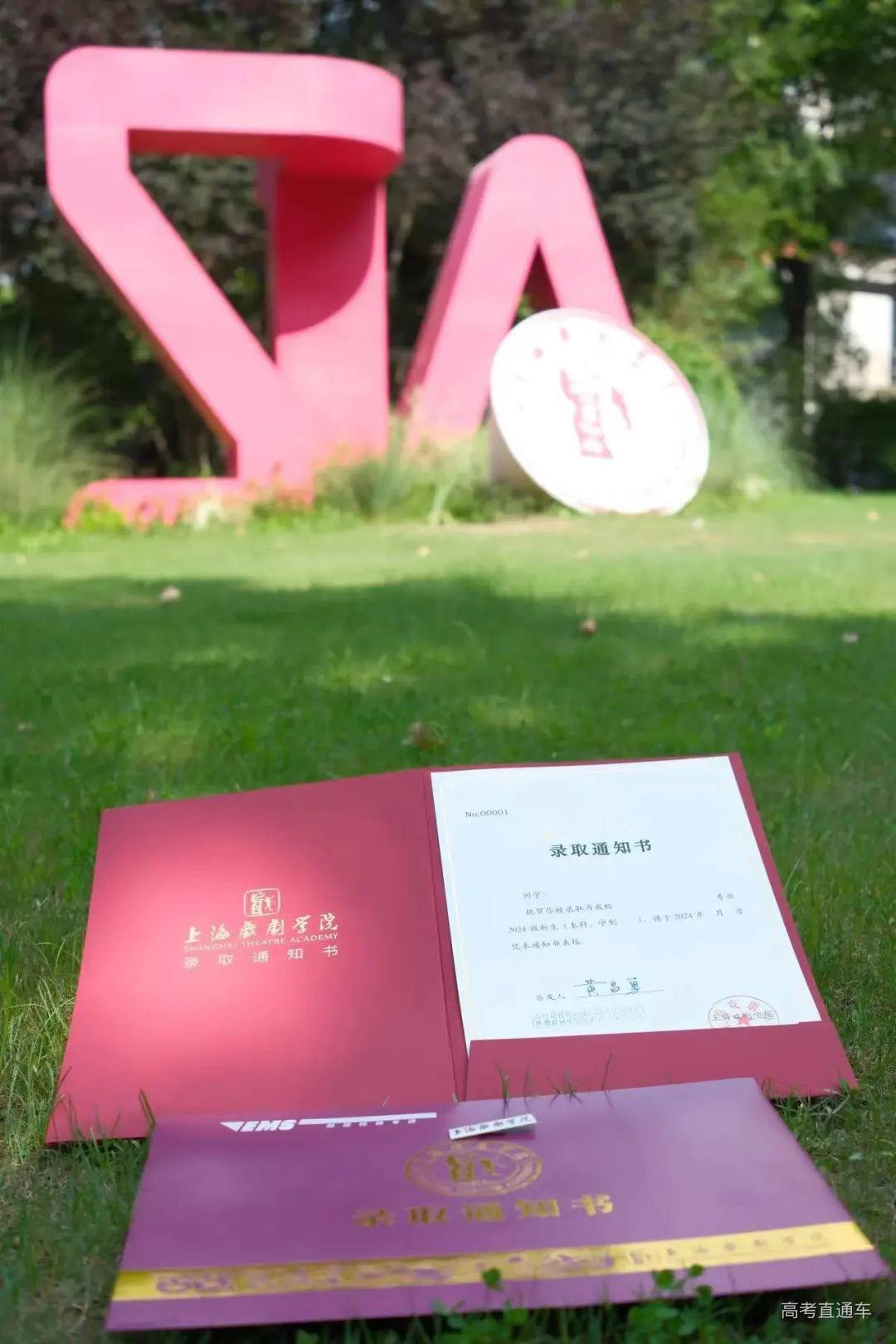 上海戏剧学院录取通知书,封套以明代方以智所著《通雅》中记载的“北紫色”为底色。1956年,在校名几经变更后,正式确定以“上海戏剧学院”为名并沿用至今,今年的EMS信封以及录取通知书底部图案选自1957年首次以上海戏剧学院名义举行的毕业公演海报上的通用纹底,其戏剧元素丰富多样,意象隽永,寓意由过往向未来的新篇章就此开启。
