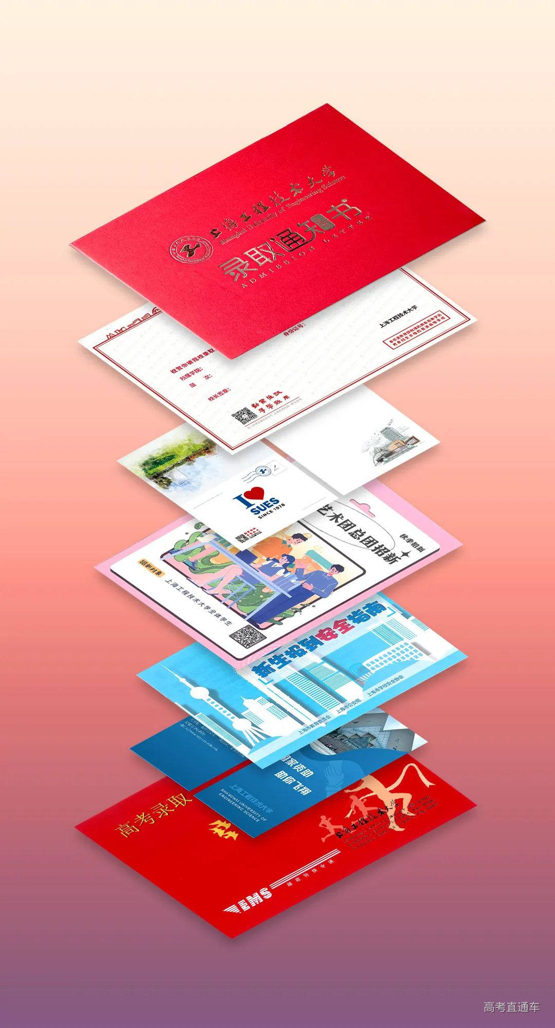 上海工程技术大学录取通知书以“成功红”为主色,以“博学银”烫金文字,以“理想蓝”为内衬。通知书巧妙融合了学校的标志性建筑元素,让每一位新生在初见之际,便能深刻感受到来自上工程的温馨祝福与殷切期望。每份录取通知书内,还精心附赠了两张专属于新生的校园风景“盲盒明信片”——一张“致亲爱的家人”,鼓励学子们在成长的路上不忘亲恩;另一张“致四年后的自己”,激励新生在大学期间勇敢追梦,不负韶华。