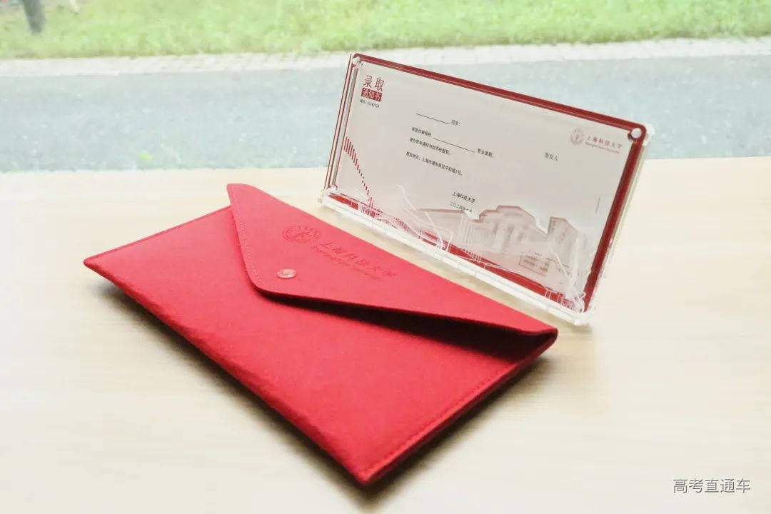 上海科技大学录取通知书采用透明相框设计,正面相框中的插片由上科大标志性建筑组成,背面“立志、成才、报国、裕民”八个字,既是上科大的育人理念,又是上科大人锲而不舍的目标,希望能够激励新加入上科大的同学们不断拓宽视野与思维,发挥潜力和才华,为国家、为科研事业贡献自己的力量。