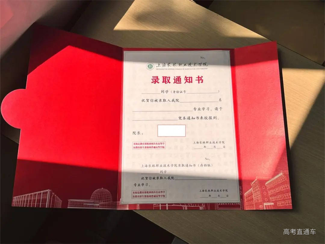 上海农林职业技术学院录取通知书由外壳和内页两部分组成。外壳以“中国红”为底色,封面以“金色麦穗”为设计元素,字体和校徽采用烫金工艺,与底色相得益彰。内页以“农”字为底纹,展现“农”字的演变过程,体现“尚农乐耕 生生不息”的校训和“为农服务 特色立校”的办学宗旨。