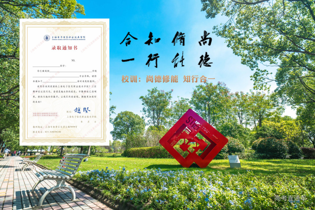 上海电子信息职业技术学院录取通知书以“象牙白”为底色,配以亚麻色波浪线边框和底纹。通知书整体简洁大方,顶部为蓝色校徽和舒同体校名,主体部分为考生姓名和录取专业。每份通知书向新生发出号召:“让我们共赴前程,拥抱更加美好的未来!”