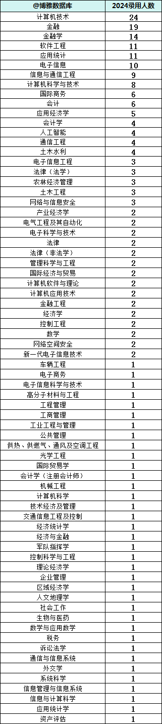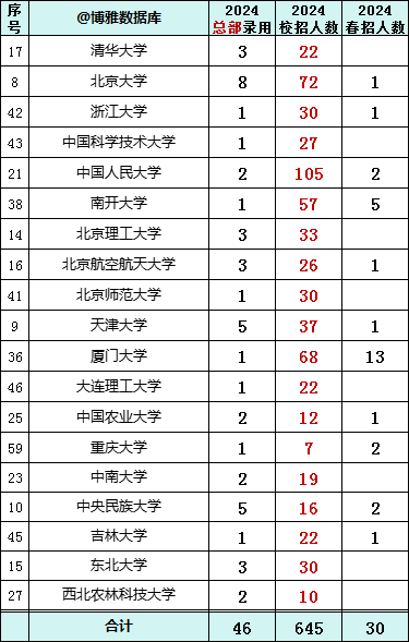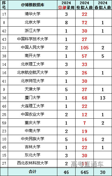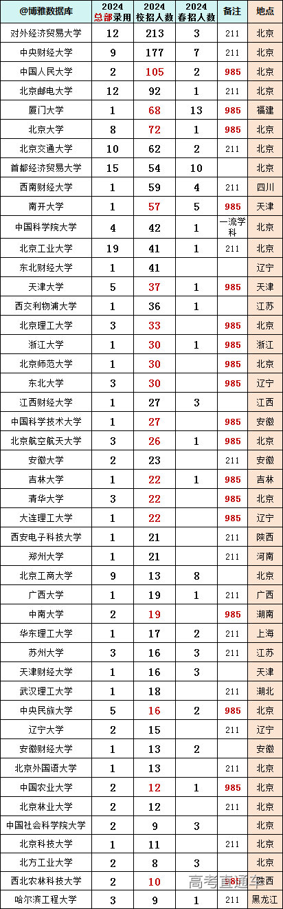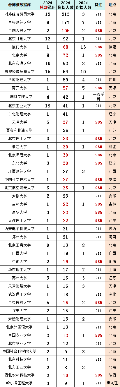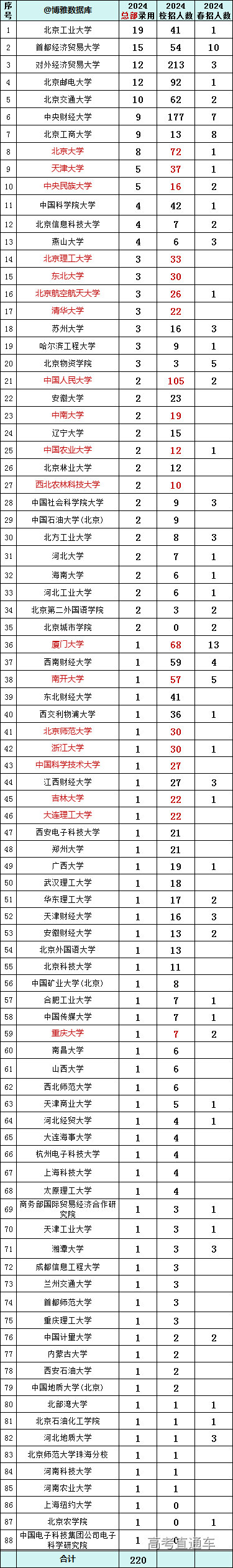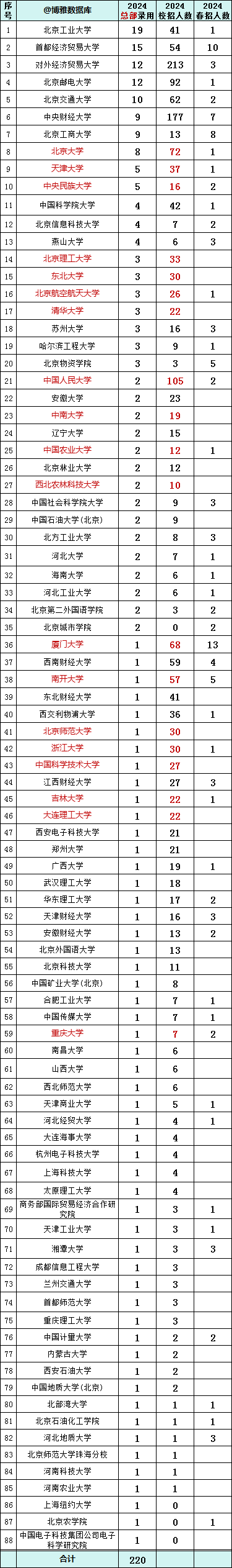 贸大共录用216人,总部录用12人。 央财录用184人,总部9人。 人民大学录用107人,总部2人。 北邮录用93人,总部12人。详情如下: