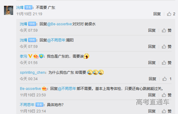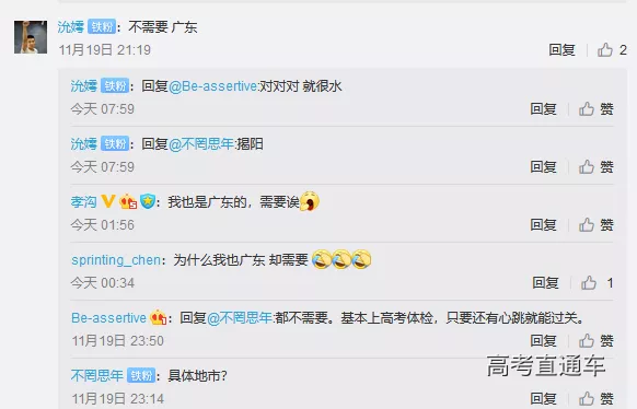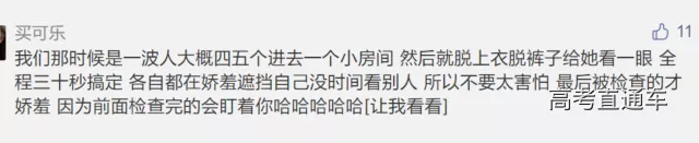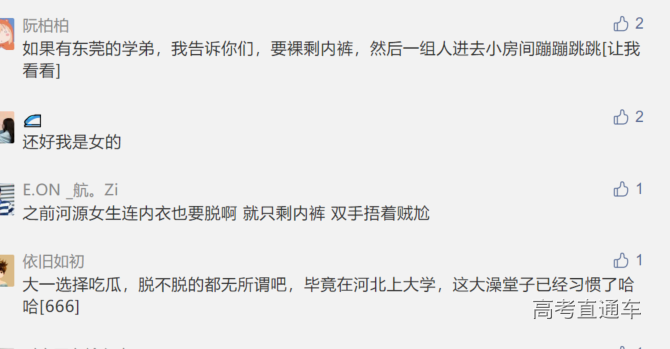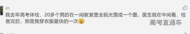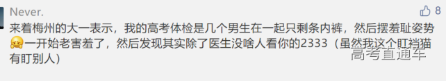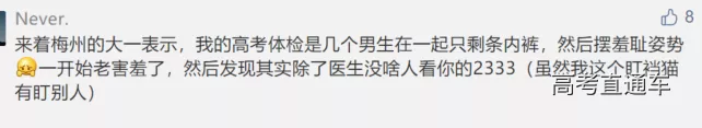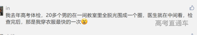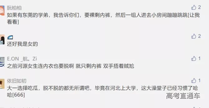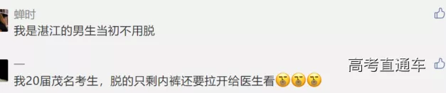 从同学们的评论中车车发现,广东各地市间高考体检脱衣情况差异较大,脱光、不用脱、脱剩内衣裤的情况都有,当有同学表示不需要脱衣时,立马有同学回复表示“为什么我也广东,却需要”……