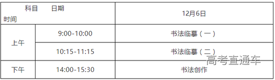 书法艺术和书法教育类考试全省考生随机编排在长沙市内若干考点,具体考试地点安排见《专业考试证》。考生须在考试前3天开始登录“报名缴费指定系统”打印《专业考试证》,12月5日下午17点前往考试地点熟悉笔试考场。考生必须凭第二代居民身份证以及《专业考试证》在规定的时间和地点参加专业考试。考试时间具体安排如下:
