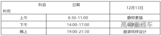 考试所需绘画工具、剪裁工具等自备。服装工艺考试具体时间、地点详细安排由考点另行公布,静物素描、服装设计、服装纸样设计考试时间统一安排如下: