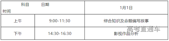 考试时间统一为2021年1月1日,考生须在考试前3天开始登录“报名缴费指定系统”打印《专业考试证》,12月31日下午17点前往考试地点熟悉笔试考场。“综合知识及命题编写故事”科目开考15分钟(1日上午9∶15)后,考生不得进入考室;“影视作品分析”科目开考前15分钟(1日下午14∶15)后,考生不得进入考室。考生必须凭第二代居民身份证以及《专业考试证》在规定的时间和地点参加专业考试。其中笔试时间统一安排如下: