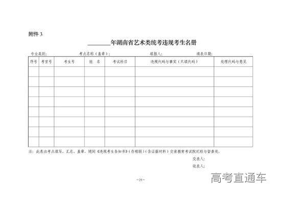 (三)切实加大对违规行为的查处力度。要加强考生身份核查,杜绝代考、换卷等严重违规事件的发生;要加大考风考纪监察力度,在醒目位置设立举报箱、公布举报电话,严厉查处弄虚作假、徇私舞弊者。要按照《湖南省普通高校招生考试考生违规行为认定及处理程序》(见附件1)的规定做好对违规考生的处理,并在当场考试结束后,立即在公布栏张榜公布考生违规事实(附件2);有关违规考生的记录表、名册(见附件3)、证据材料和公布栏缩印件,必须在考试结束后一天内报送我院纪检与督查处。对于考生、工作人员及考点学校的违规行为,将严格按照《国家教育考试违规处理办法》《普通高等学校招生违规行为处理暂行办法》《事业单位工作人员处分暂行规定》《中华人民共和国公职人员政务处分法》等规定严肃处理。我院将建立艺术类统考考点退出机制,凡存在工作人员严重违规、考试管理混乱等违规行为的考点学校,视情节轻重,责令整改或取消该校下一年度的考点资格,并按规定追究相关单位和人员的责任。