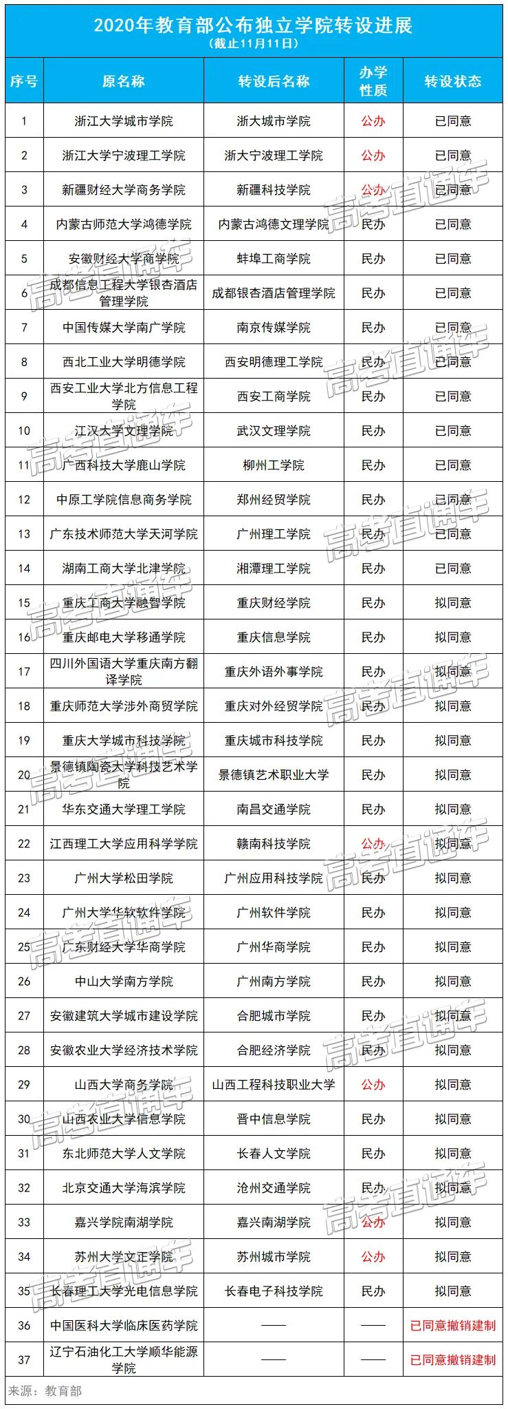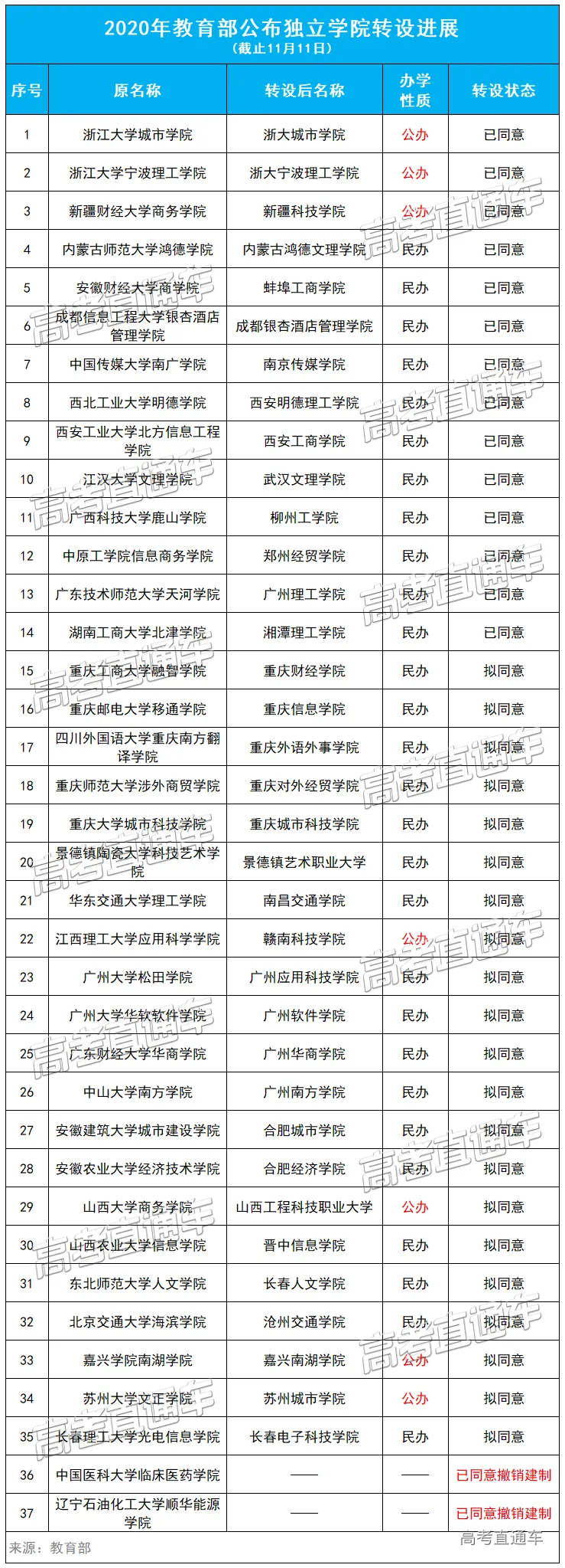 2020年, 一批新建大学正在拔地而起, 而另一批大学正在逐渐消失。 今年5月份,教育部印发《关于加快推进独立学院转设工作的实施方案》,明确到2020年末,各独立学院需要全部制定转设工作方案,同时推动一批独立学院实现转设。转设路径分为三种:转为民办、转为公办或终止办学。 1.转为民办:办学协议完善,办学主体间权利义务划分清晰,办学条件达到本科高校设置标准的独立学院,可转设为独立设置的民办普通本科高校; 2.转为公办:无社会举办方(指由公办高校单独举办,公办高校与学校基金会、校办企业、学校附属医院、校友会或学校工会等下属机构合作举办,以及公办高校与地方政府合作举办,下同)或社会举办方拟退出举办、地方政府有条件承接举办的,鼓励转设为独立设置的公办普通本科高校; 3.终止办学:已停止招生,或由于各种原因无法完成转设,或举办者主动提出且条件具备的,终止办学,撤销建制。 2所学院撤销建制 今年7月,教育部网站公布了关于撤销中国医科大学临床医药学院建制、辽宁石油化工大学顺华能源学院建制的批复,正式同意辽宁省教育厅撤销这两所高校的建制。 1 辽宁石油化工大学顺华能源学院 辽宁石油化工大学顺华能源学院,创办于2001年。是由石油化工大学,和煤炭科学研究总院抚顺分院联合重组、创办的全日制本科独立学院。但在2013年时,本学院就被辽宁石油化工大学完全托管,此后便不再招生。截止到2020年,教育部撤销学院建制。 2 中国医科大学临床医药学院 中国医科大学临床医药学院,创办于2003年,院校坐落于辽宁省本溪市,是一所民办、独立全日制本科院校,主要院系为预防医学和临床医学。但这所院校在2012年时,已经停止招生。截止到2020年,也没能批准招生。 21所独立学院转设 至此,教育部今年已经公布了37所独立学院转设相关情况,其中(拟)同意7所独立学院转设为公办本科高校,2所独立学院撤销建制。 然而无论是转设还是终止办学,一批人记忆中熟悉的母校,都已变得陌生,甚至正在逐渐“消失”。 4所院校不再招生 1 北京师范大学珠海分校 北京师范大学珠海分校是位于广东省珠海市的一所高校,这所学校的办学性质属于独立学院。这所学校从2019年起,就开始减少招生计划了,在2021年停止招生,2024年就会终止办学。 学校停办后,已毕业学生的权利和义务都将由母体学校,北京师范大学珠海校区全部承接。 2 上海体育职业学院 这所学校是一所历史悠久的学校,学校里面的办学机构都是一等一的好,还有很多奥运冠军在这所学校毕业,但是在今年的时候这所学校已经被教育部公示撤销。有很多人觉得这所学校撤销是非常可惜的事情,但其实这所学校在2018年的时候就和上海体育学院进行合并工作了。 3 福建警官职业学院 福建警官职业学院是一所警官学校,在1999年的时候被誉为重点中专,后来随着学校的不断进步,这所学校在2004年的时候已经被誉为大专。但是这所学校也开始实行高校合并,所以在2020年的时候公布“撤销”这所学校。 4 安徽长江职业学院 安徽长江职业学院是在2018年的时候检查中不合格才导致在今年被撤销的,所以这所学校已经不可以再招生了。 以上就是4所不再进行招生的高校,在此提醒考生,报考时要注意辨别。那么,考生该如何选报高校呢? 考生如何选报高校? 1 根据自己的实际情况报考 其实选择学校也是很讲究的事情,首先第一点学生一定要选择自己喜欢的院校,然后根据实际情况来报考,学生可以看一看自己考试成绩,如果分数高可以有更高的选择,但是如果分数低就要根据当下的实际情况,择优选择了。 2 根据自己喜欢或选择热门的专业 学生在选择高校的时候不能都根据客观的因素来选择,一定要根据自己喜欢的专业来选择,因为有一个喜欢的专业可保证学生的对待专业的认真程度,也可以保证学生在就业的时候可以更好的寻找自己喜欢的工作。 3 根据学校的地理位置 还有学校的地理位置也是学生在选择学校时应该考虑的问题,毕竟学校相当于学生第二个家,在学校里面需要待很长时间,毕竟每个地方的人生活习惯都是不一样的,所以学生可以选择一些适合自己的地方,也可以选择一些比较经济比较发达的学校,这样学生在学校的周边生活会更方便一些。 总之,考生在选择学校的时候一定要提前了解学校的各种情况,避免出现报错的情况。