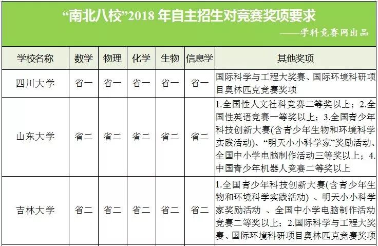 对竞赛党来说,清北华五校自然是梦中情人,但非人人都能梦想成真啊!从18年自主招生对五大学科竞赛奖项要求来看,“南北八校”报名门槛是相对较低的。除川大明确要求省一外,另有4校均只要求省二,文科类的“两外一法”均未对学科竞赛作出明确要求,这里需要说明的是,北外采取的是不同于自主招生的综合评价招生模式。