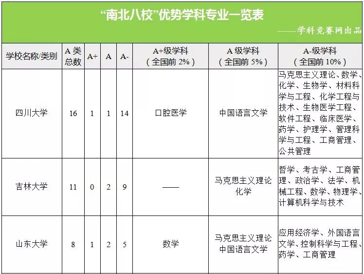 据教育部最新公布的第四次学科评估结果显示,“南北八校”共有53个A档学科,其中:四川大学总数最多,达16个;A+学科6个,包括川大堪称全球一流的口腔医学,山大领跑全国的历史最悠久的数学,以及华南理工的轻工技术与工程,北外、上外的外国语言文学和中政大的法学,均在国内具有至高的学科地位。