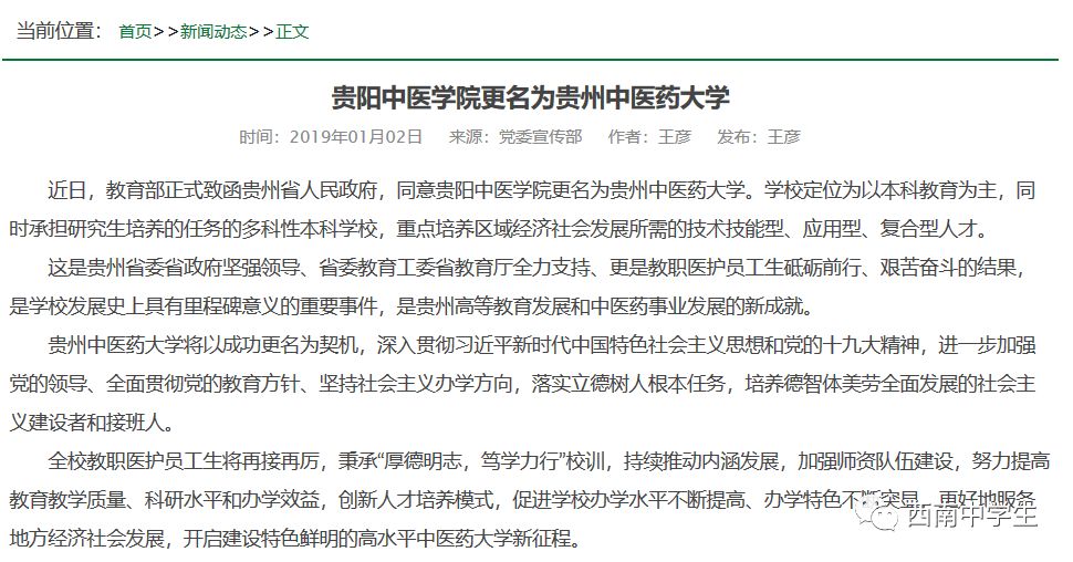 近日,教育部正式致函贵州省人民政府,同意贵阳中医学院更名为贵州中医药大学。贵阳中医学院官网也在1月2日发布了相关的通知。