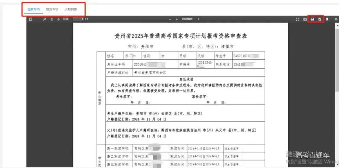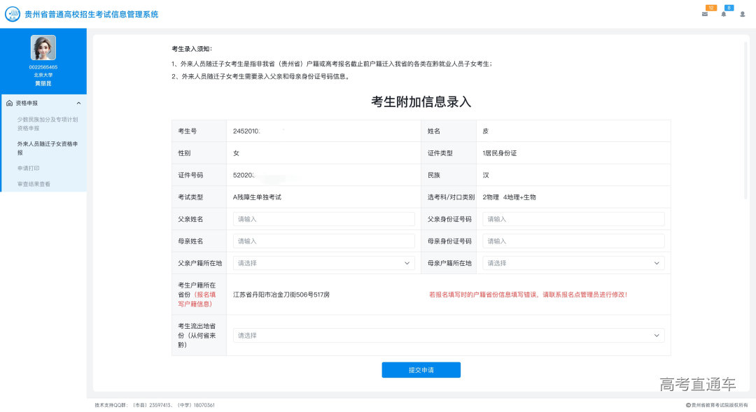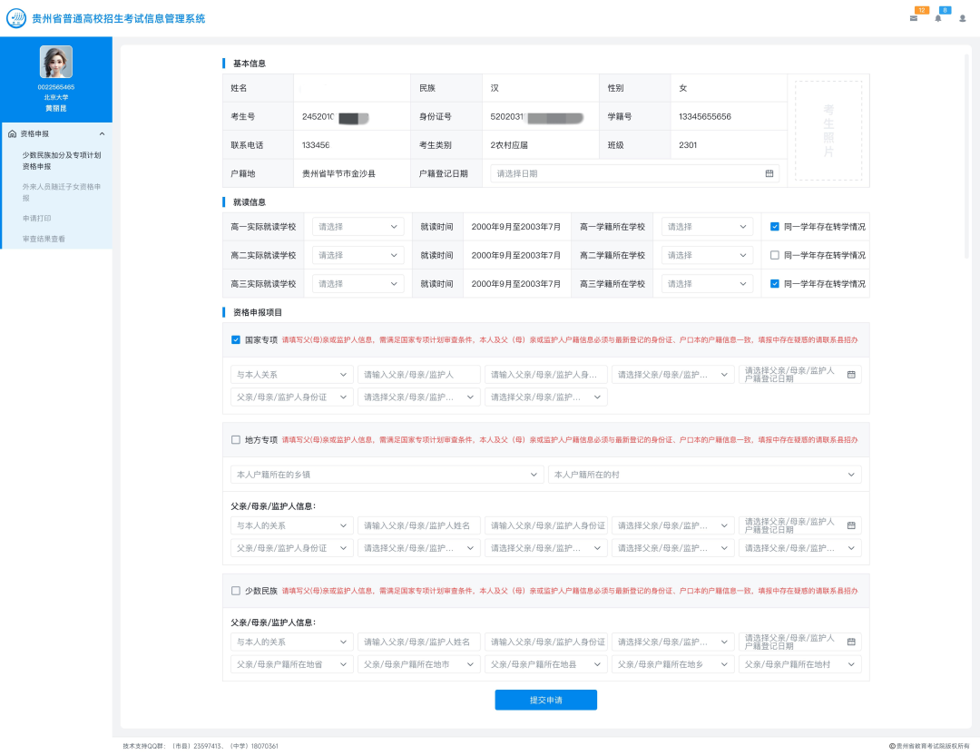 考生在电脑端通过浏览器(推荐使用谷歌浏览器)访问贵州省普通高校招生考试考生综合信息平台(http://gkks.eaagz.org.cn),输入身份证号和密码进行登录。 考生须如实、准确填写相关信息,生成并打印相关资格审查表,并按要求提供相关纸质证明材料。外来人员随迁子女报考资格申报,由各县(市、区)向审核对象发放资格审查表,考生在填写资格审查表的同时,登录“贵州省普通高校招生考试信息管理系统”,进入“资格申报”栏目填写父母基本信息和流出省份,并按要求提供相关纸质证明材料,考生不需要在系统中另行生成和打印资格审查表。 (一)申报少数民族加分及专项计划资格 1.申报信息填写 考生登录系统后,进入【我的资格申报】->【少数民族加分及专项计划资格申报】,阅读考生申报须知,填写个人基本信息、就读信息。勾选有意向申报的项目(包括国家专项、地方专项及少数民族加分),录入相关信息,点击【提交申请】按钮。 2.资格审查表打印 考生提交申请之后,进入【我的资格申报】->【资格审查表打印】,打印对应的资格审查表。 3.提交审核材料 将打印出的资格审查表及相关纸质证明材料提交县级招生考试部门进行审查。 (二)外来人员随迁子女报考信息填报 贵州省招生考试院 2024年11月22日