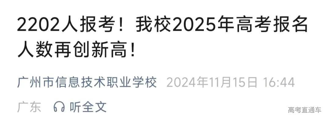 据广州市一报名点“广州市信息技术职业学校”官微消息,学校2025年高考报名人数再创新高,达2202人!
