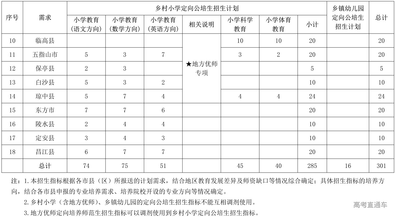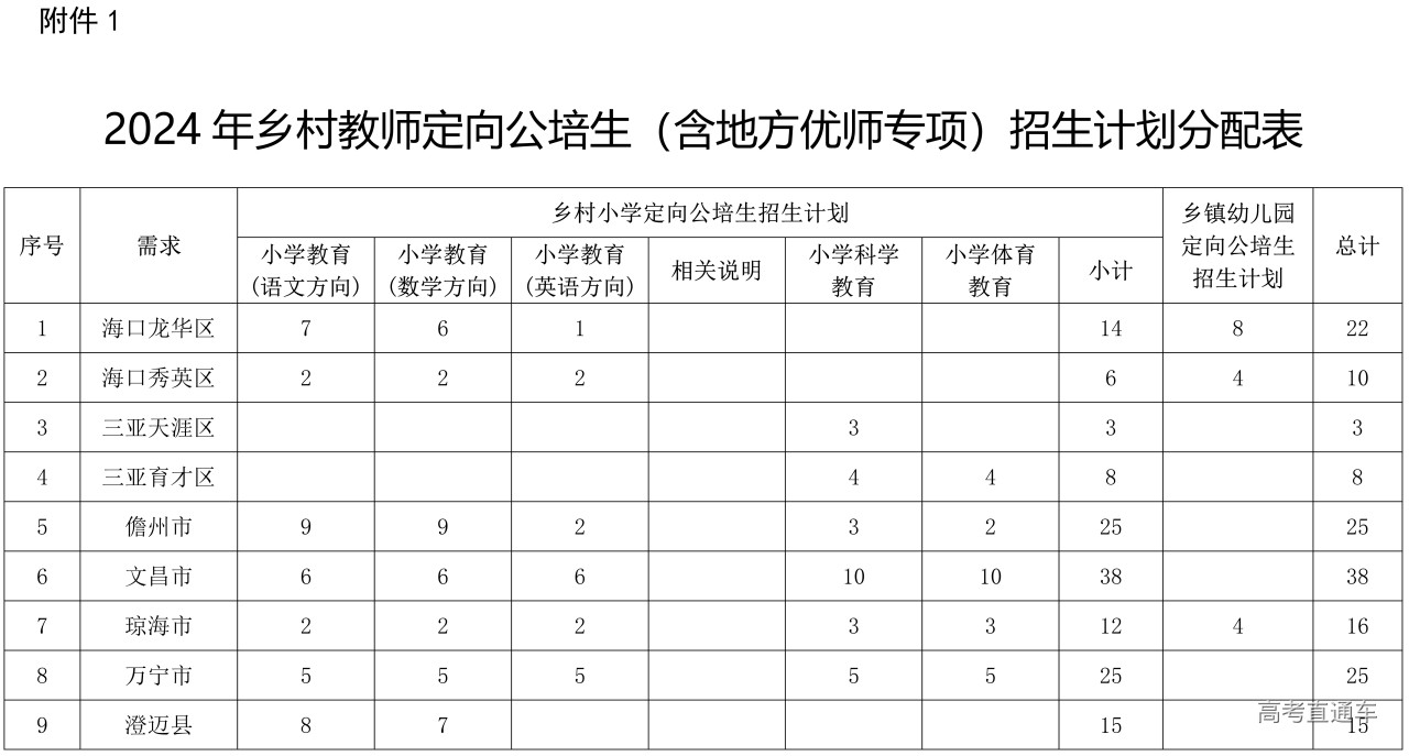 为贯彻落实《中共海南省委 海南省人民政府关于全面深化新时代教师队伍建设改革的实施意见》(琼发〔2018〕17号)、《海南省人民政府办公厅关于印发〈海南省学前教育发展布局规划(2020—2035年)〉和〈海南省中小学教育发展布局规划(2020—2035年)〉的通知》(琼府办〔2020〕16号)以及教育部办公厅有关中西部欠发达地区优秀教师定向培养(以下简称地方优师专项)工作的相关文件精神,经省政府同意,“十四五”期间继续按“县来乡去”“一专多能”方式定向公费培养乡村教师(以下简称定向公培生)。我厅于2024年初印发了《海南省教育厅关于报送2024年乡村教师定向公费培养计划(地方优师)招生需求名额的通知》和《海南省教育厅关于报送2024年新增乡村教师定向公费培养招生需求计划的通知》,根据各市县(区)报送的乡村教师定向公培生(地方优师专项定向培养师范生)需求计划,现就下达2024年定向公培生(地方优师专项)招生计划及相关事项通知如下: